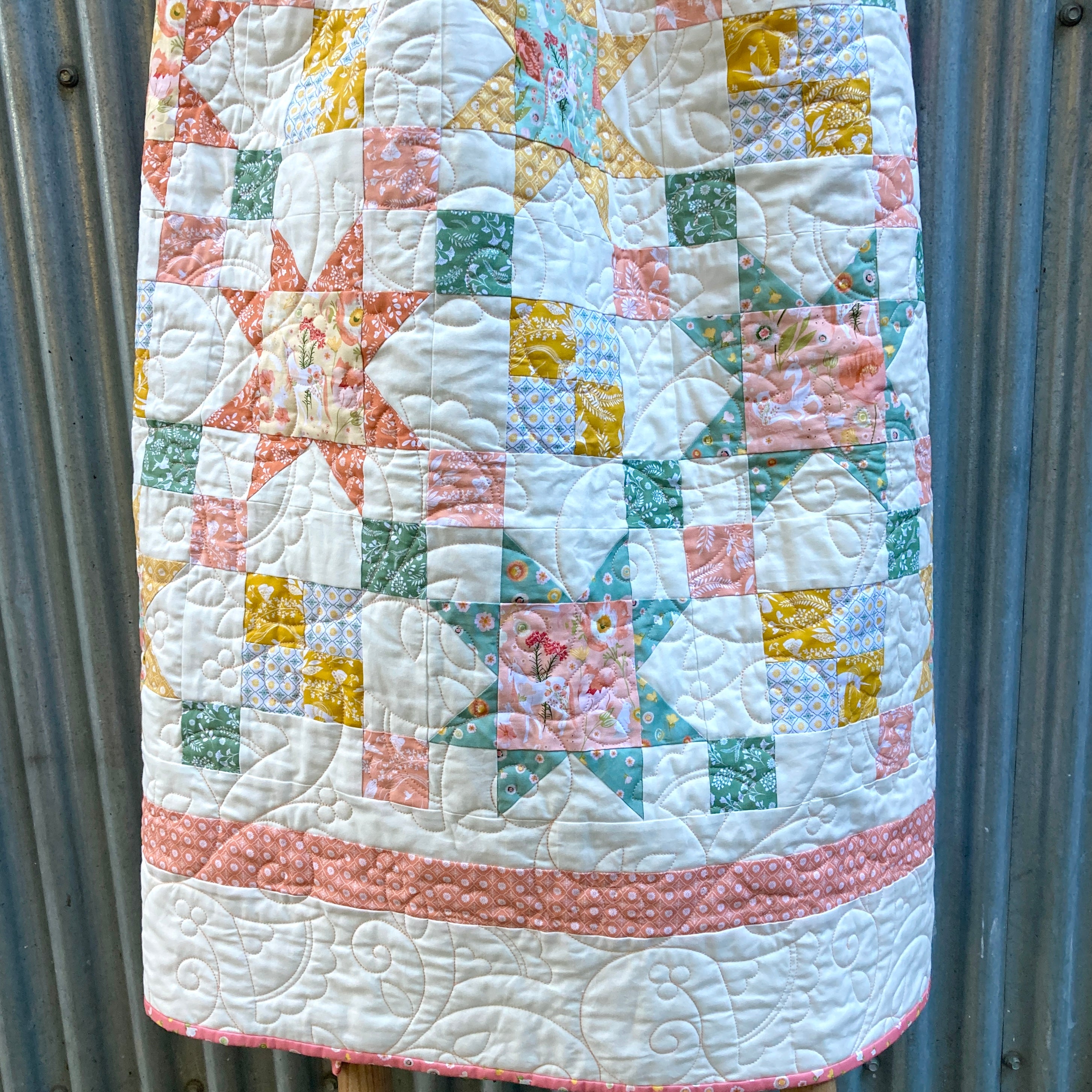 This quilt kit was created with fabrics from local designer Ginger Deverell's latest fabric collection with Poppy Cotton: Unicorn Dreams.