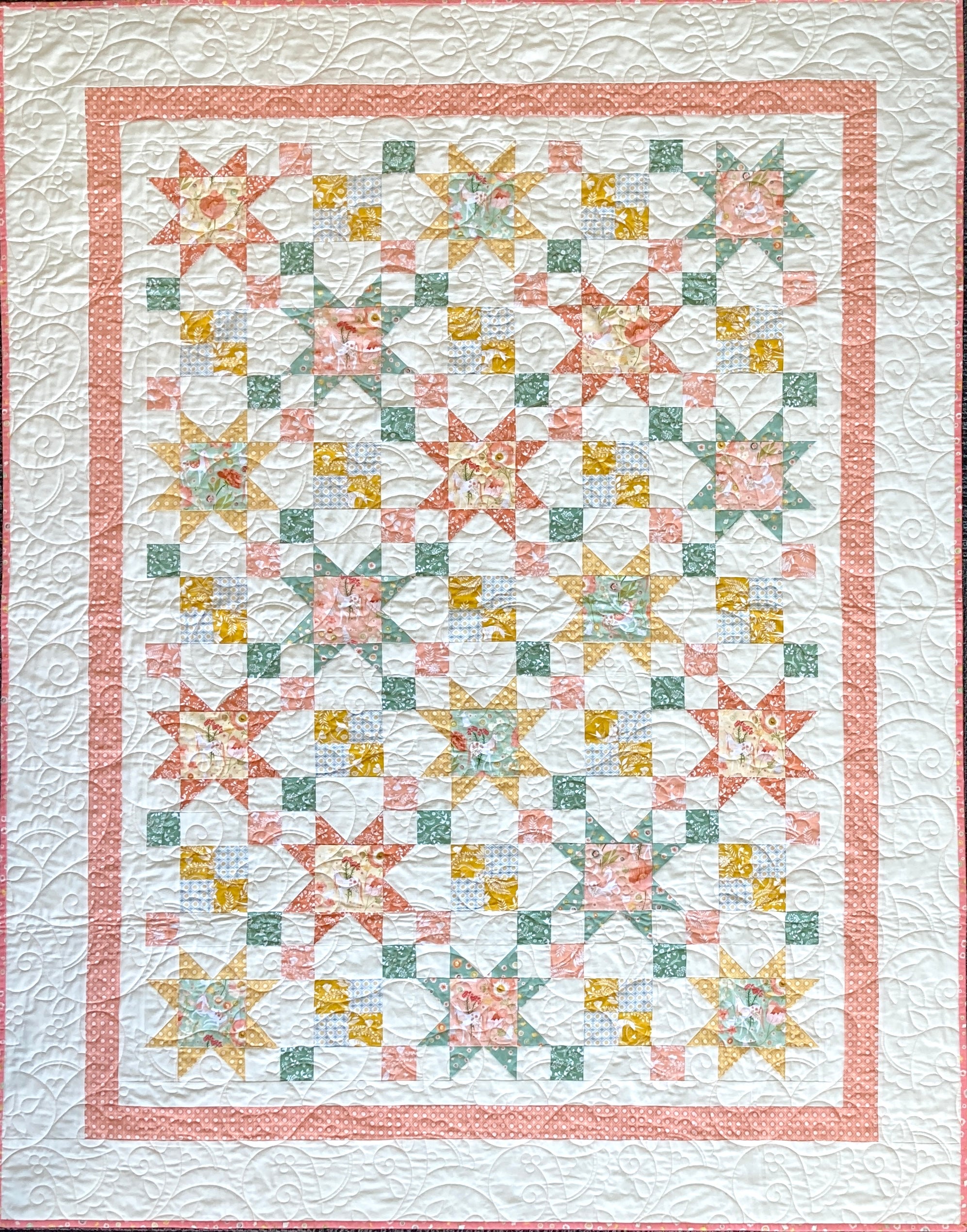 Unicorn Dreams will have your head spinning with its whimsical beauty and artistry. There are unicorns, butterflies, bunnies, birds, bugs dancing among the gorgeous flowers. The large poppies are light and airy. All the patterns are dainty with beautiful soft greens, pale peaches and buttery yellows.