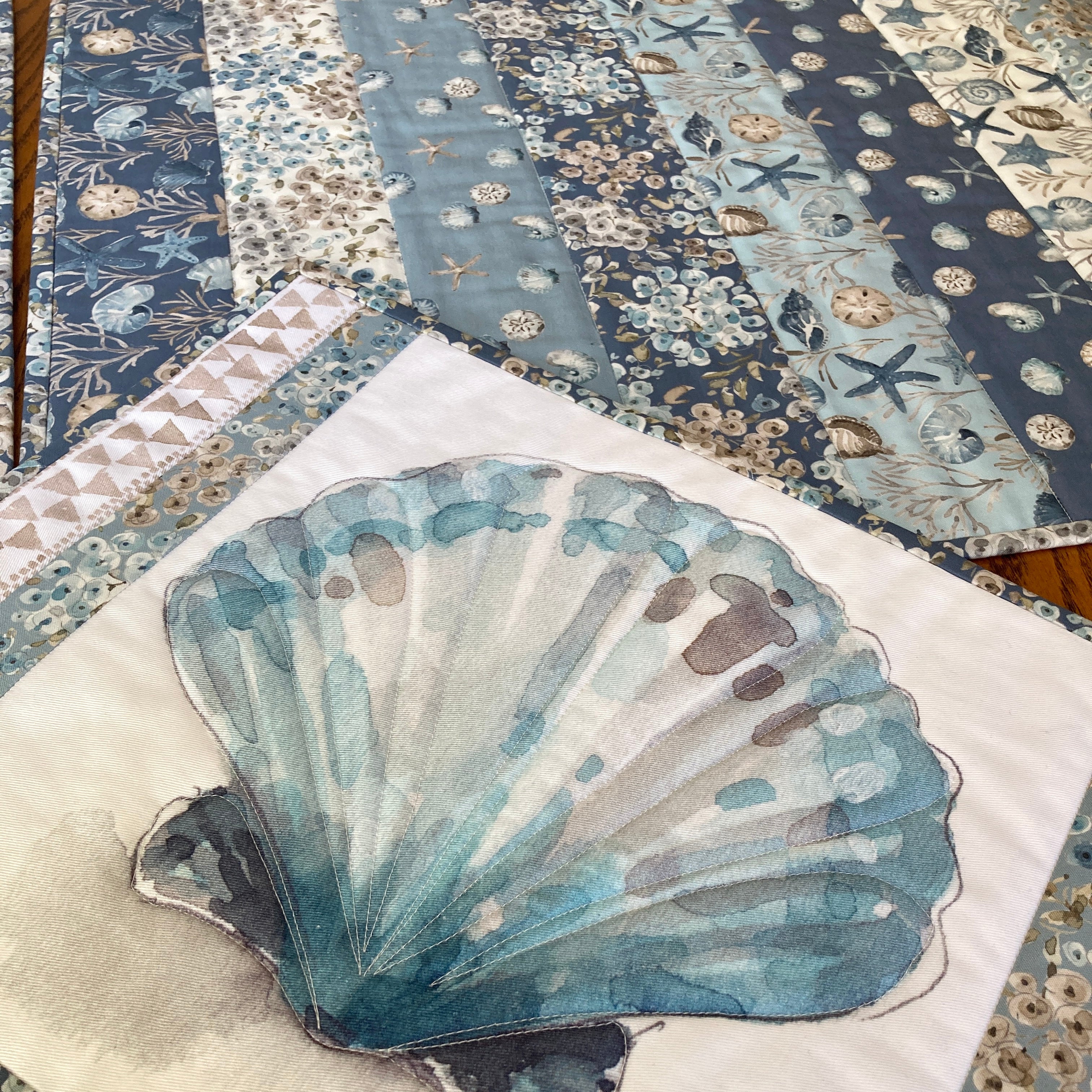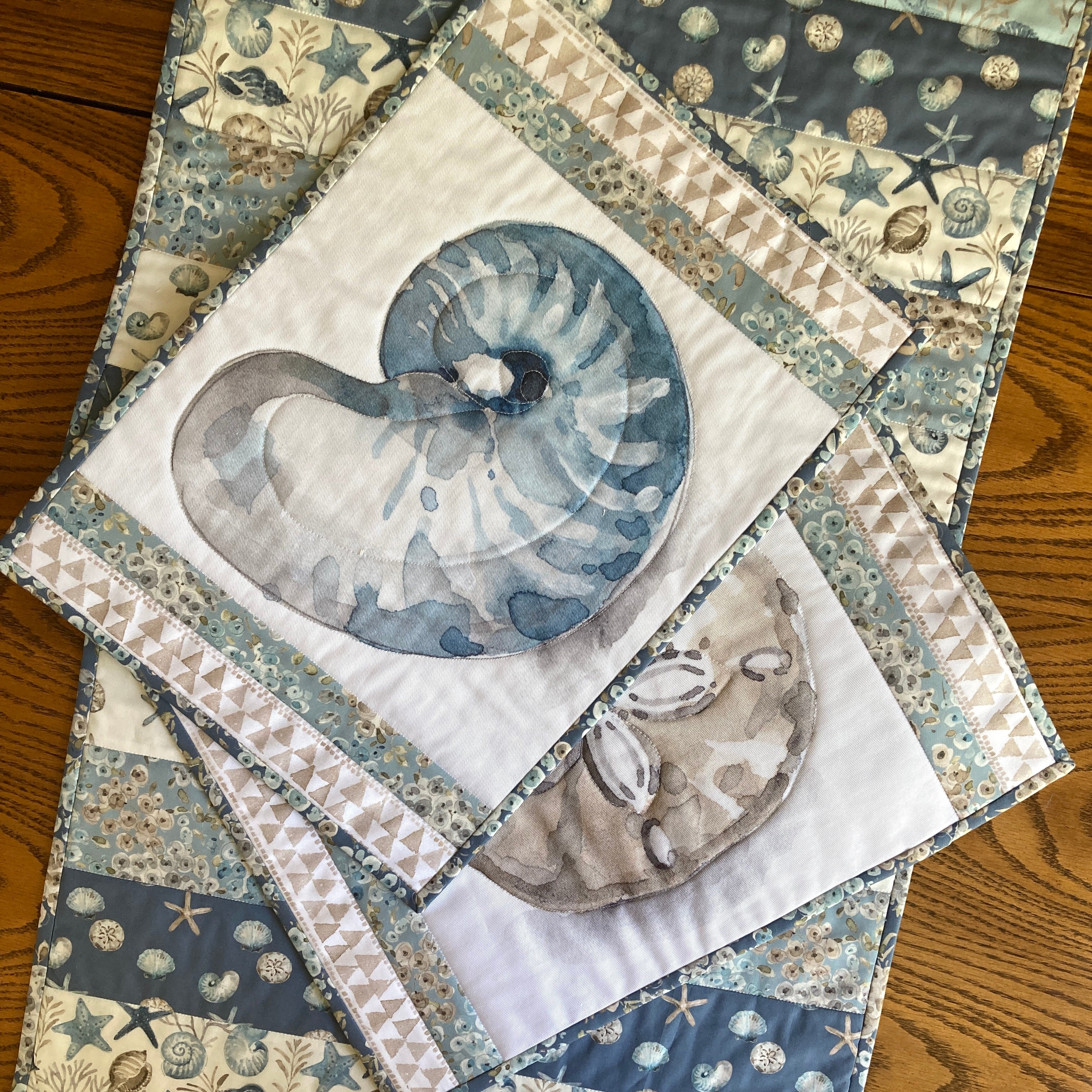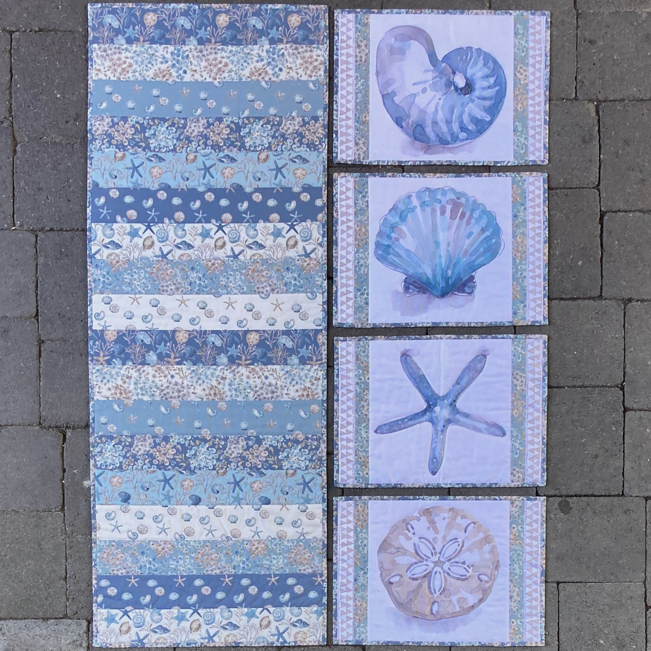 • This lovely 'Coastal' placemat and table runner set made was created with fabrics from the Blue Escape Coastal collection by Lisa Audit for Riley Blake Designs.