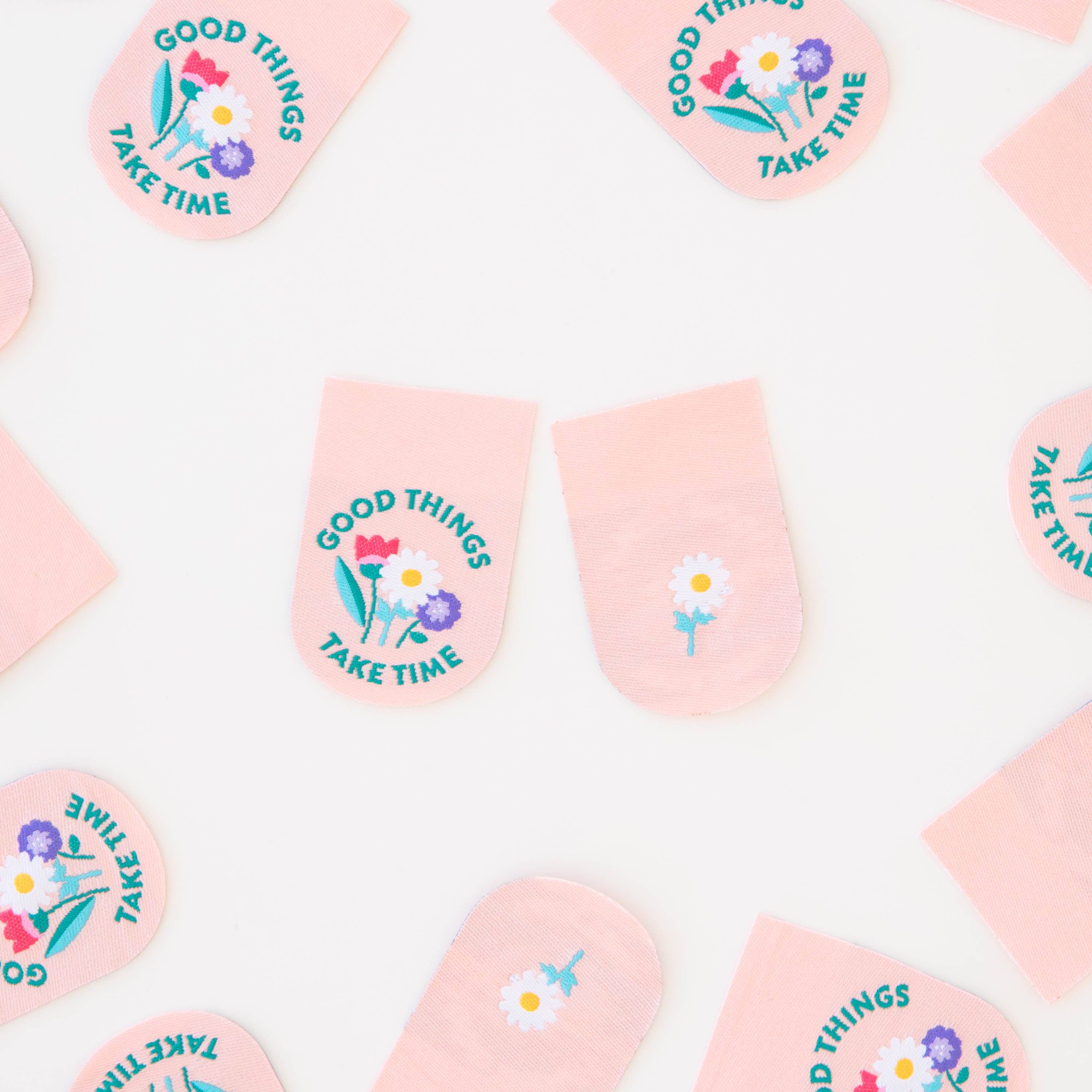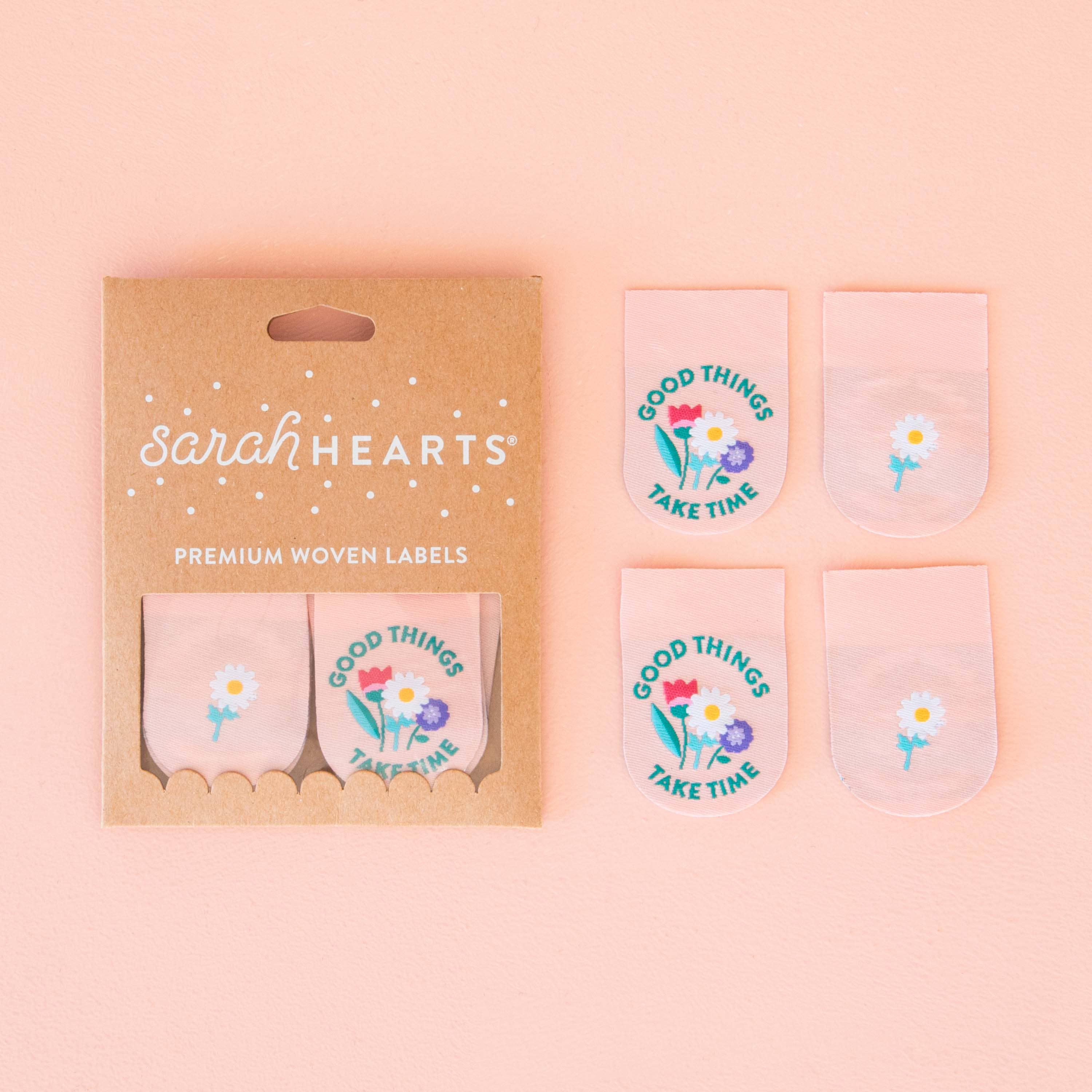 Add a special touch to your handmade creations with our Good Things Take Time Woven Labels. These laser cut, double-sided labels feature sweet florals and remind you to take your time with slow sewing. Perfect for adding a personal and unique touch to your work. **Now sold in packs of 4 labels** 3 x 4.5 cm 100% polyester manufactured ethically in China and are OEKO-TEX Standard 100 certified