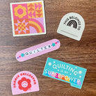 Bundle includes 5 stickers: Quilting is My Superpower, This Belongs to, Quilter Friendship Bracelet, Fabric Collector, and Colorful Quilt Block.