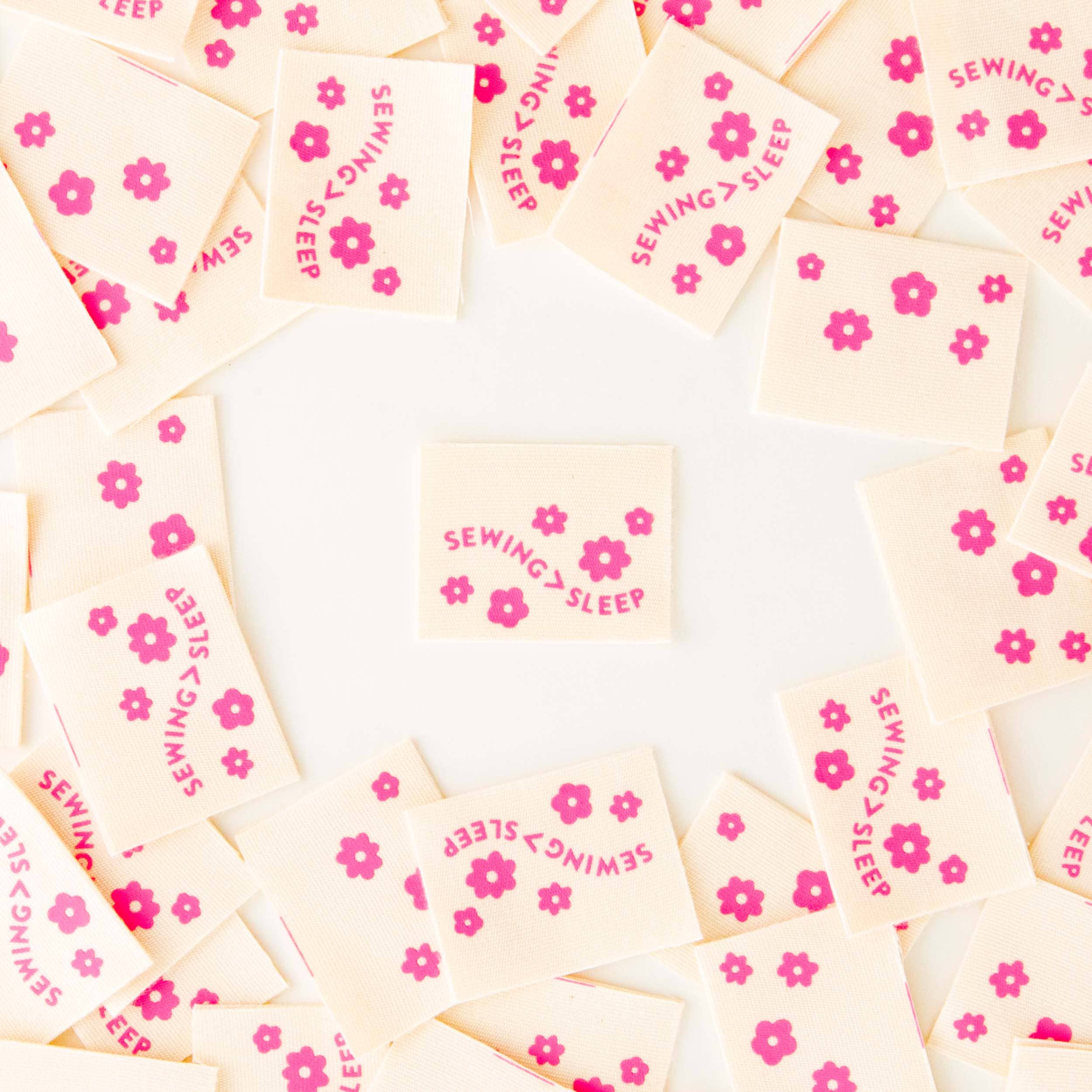 Who needs sleep anyway? If you feel sewing is greater than sleeping, this tag is for you! This double-sided label features bright pink ink screen printed on an a soft, organic cotton tag. They are super soft to the touch and never scratchy. The labels are fully washable and can handle the heat of the dryer.