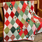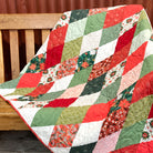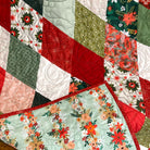 Tidings is a holiday-themed quilt kit featuring a mixture of festive fabrics in multi-tonal reds, greens, and whites.