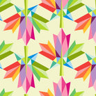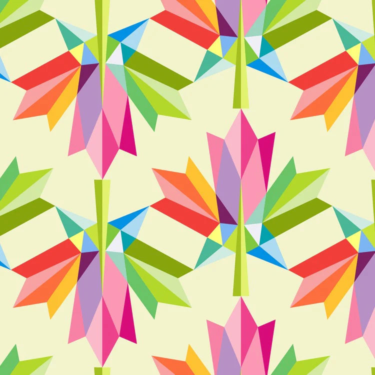 The pattern uses the foundation paper piecing (FPP) technique, and is assembled using a colourful selection of Kona Solid Cottons.