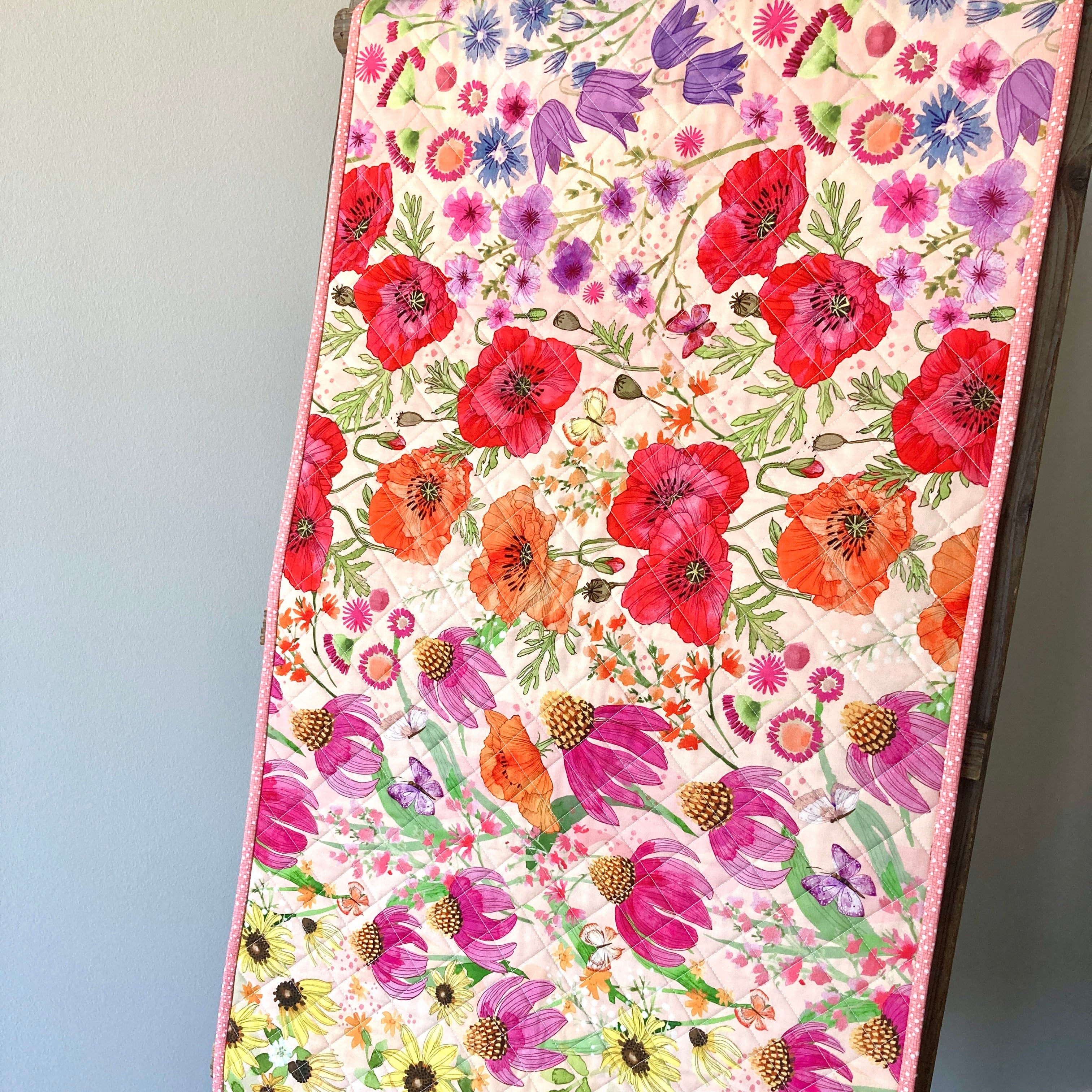 Create a simple, reversible table runner from the gorgeous Superbloom fabric collection by Robin Pickens for Moda Fabrics.