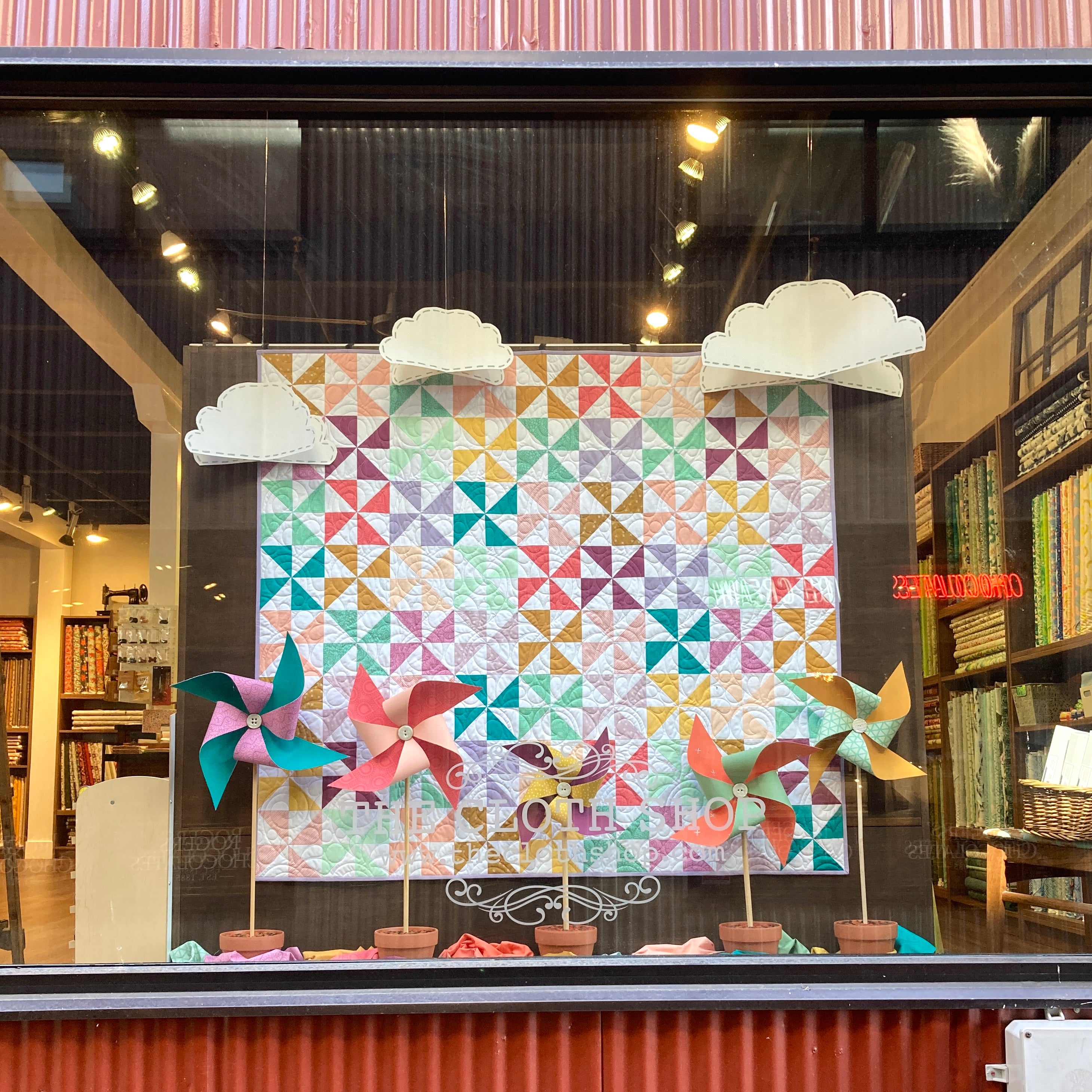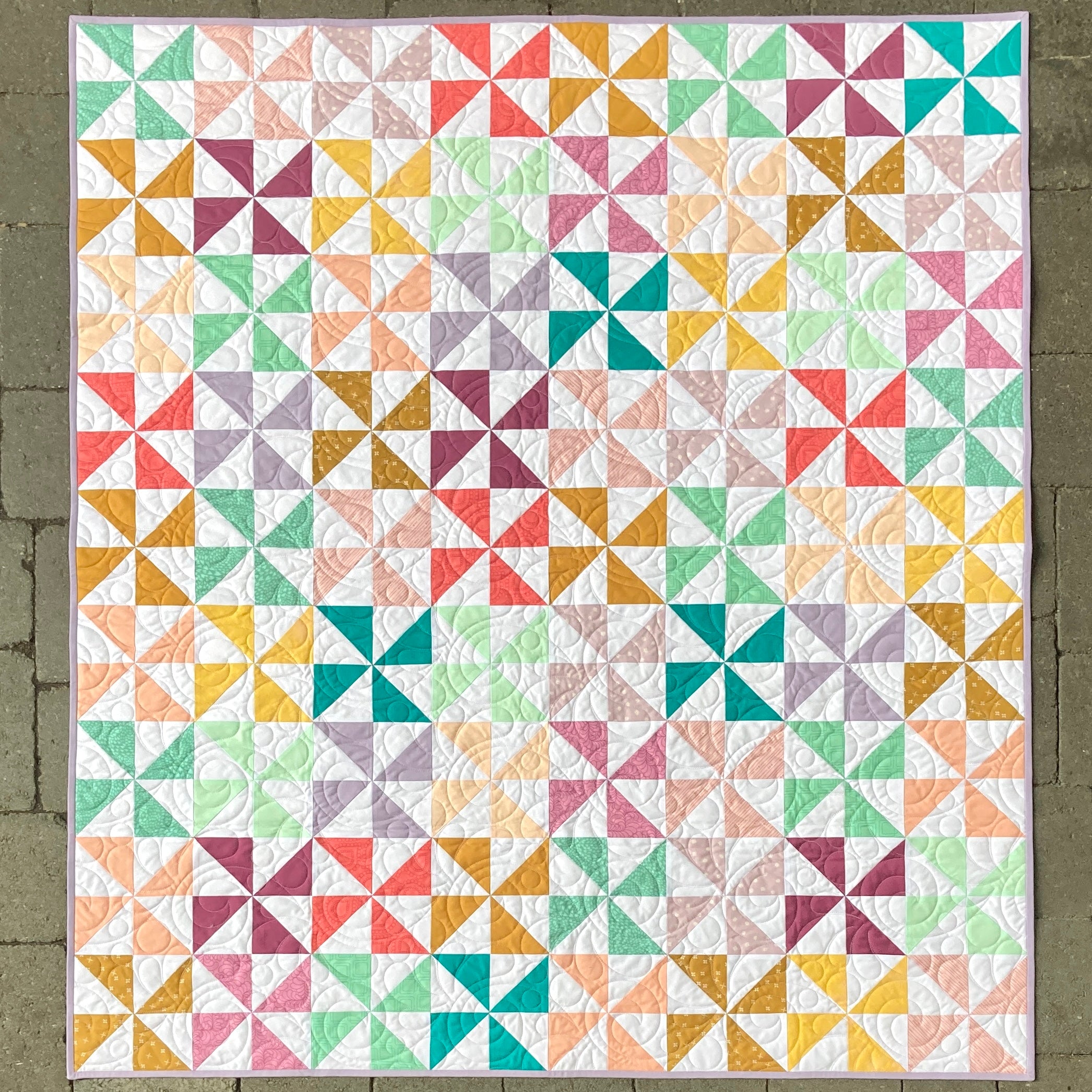 This gorgeous lap quilt was created with a hand-selected assortment of low volume prints and Kona Solids from our fabric collection. We paired it with the Bella Moon Whirligigs Quilt Pattern which uses a quick piecing technique to make half square triangles.