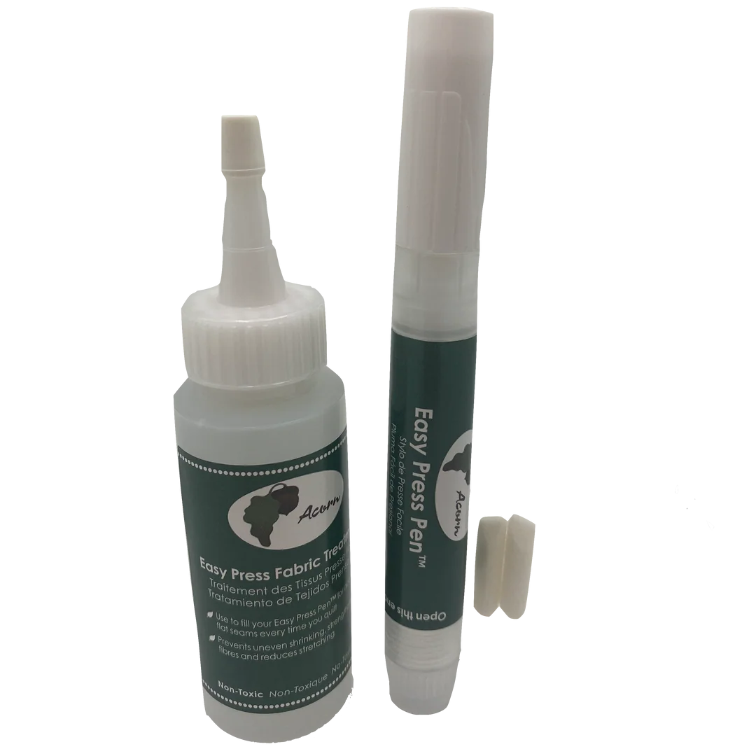 • Pen comes empty in package, comes with  Easy Press Fabric Treatment™ 2 oz . Try our Easy Press Mist Bottle™ available exclusively in our Easy Press Fabric Treatment™ Combi Pack with a 16 oz bottle of Easy Press Fabric Treatment™ treat your whole fabric before you begin sewing! • Seams are precise and flat • Accurate piecing • Easier quilting & appliquè • Non-Toxic A fully equipped kit with everything you need to start piecing like an expert! • Easy Press Fabric Treatment™ 2 oz • Easy Press Pen™ • Easy Press Pen Replacement Nibs™ - 2 pack Use: Pressing / Flat Seams Size: 3in x 9in