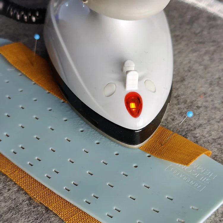 One side has a gentle curve, the other is straight. Both are marked with small holes to let you mark your fabric for super-accurate placement. Plus you can use the holes to pin through the hemmer without damaging it, and the holes let the steam through to your fabric.