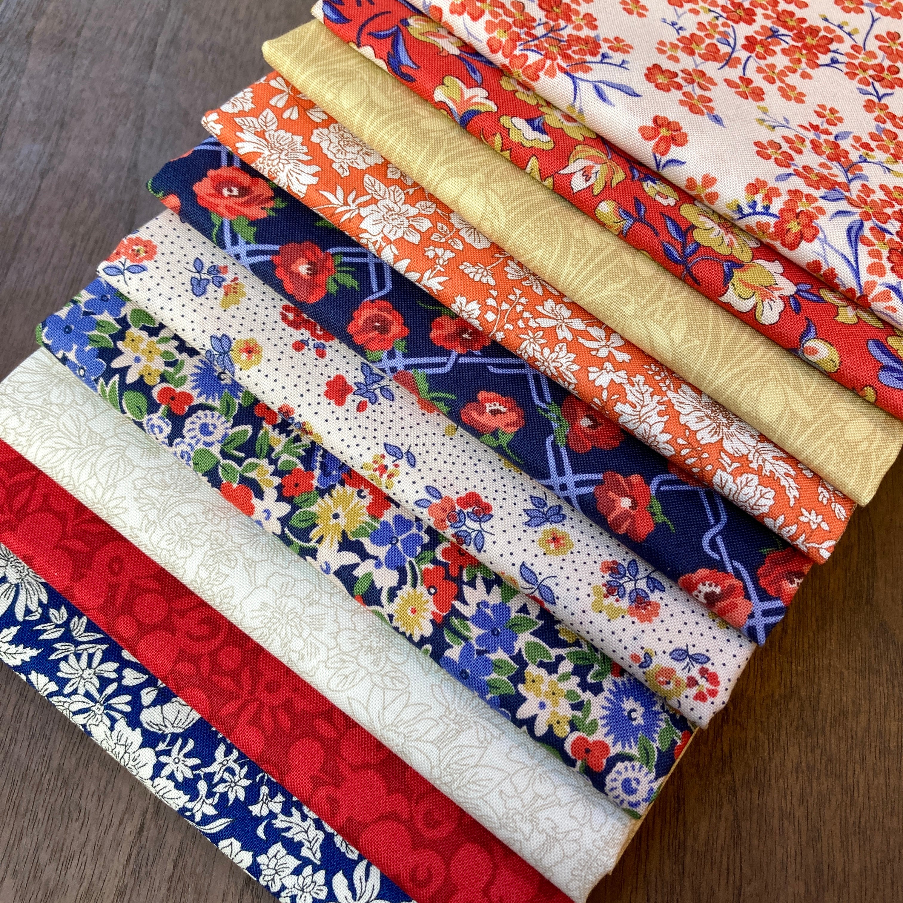 Fat quarter pack includes one fat quarter (20" x 22") each of 10 fabrics in the collection.