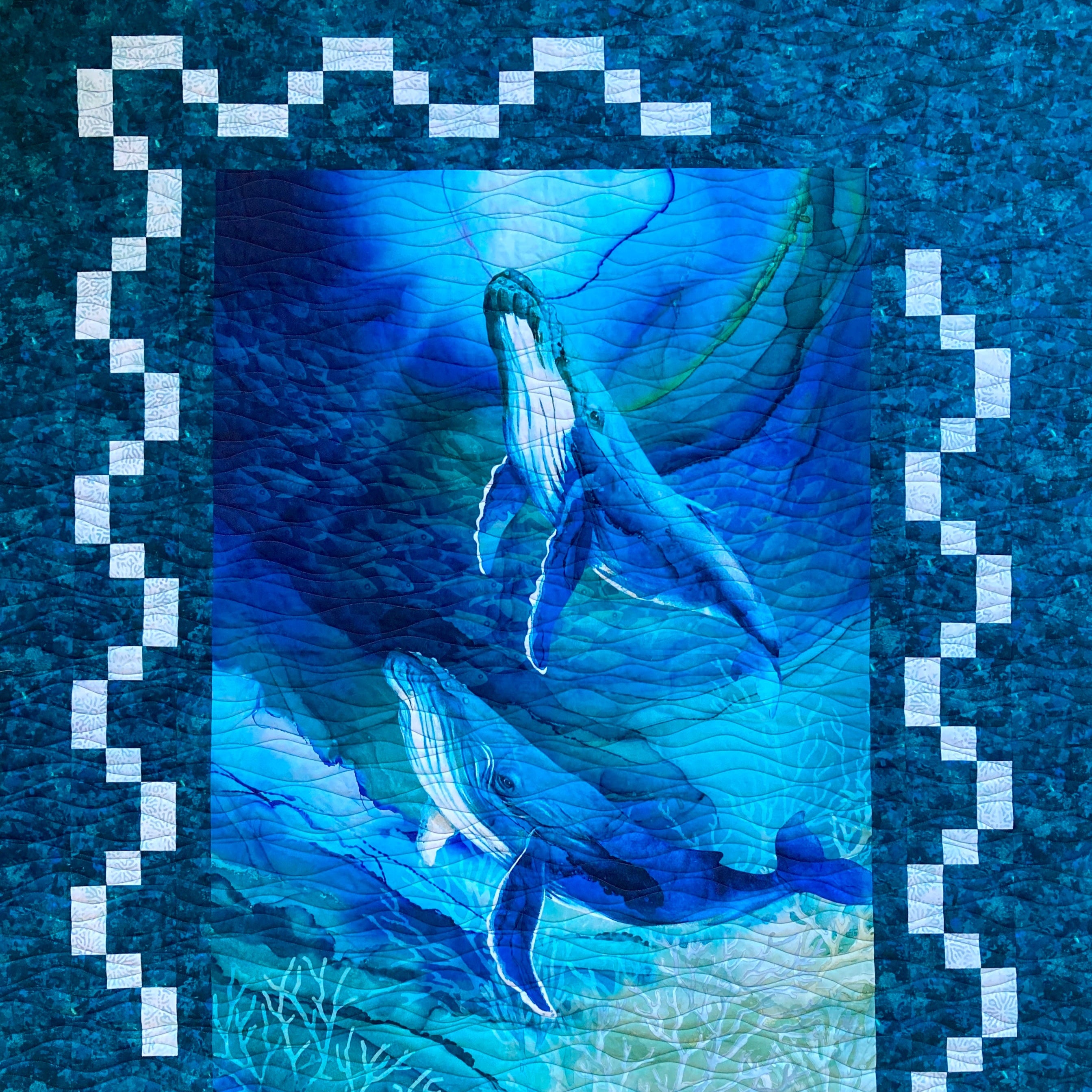 Our Deep Blue Quilt Kit features a stunning whale panel from Northcott Fabrics, highlighted by a blue wave border.