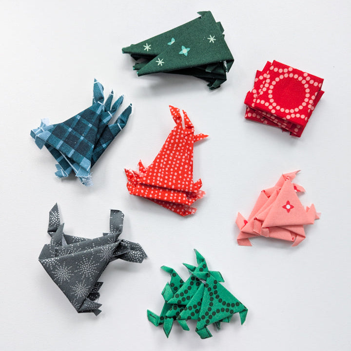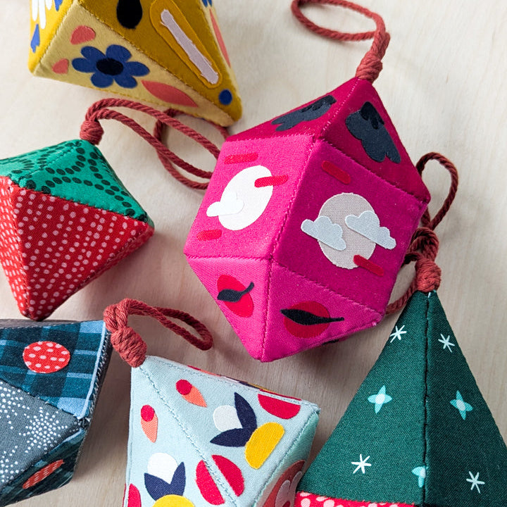Play with shapes and colour to craft your own set of hand sewn ornaments! Instructions will guide you through English Paper Piecing techniques to create your own 3D forms and how to add your own delightful embellishments with simple iron-on applique. Whether hung on your tree or wrapped up as a gift, these ornaments carry a touch of handmade holiday magic.