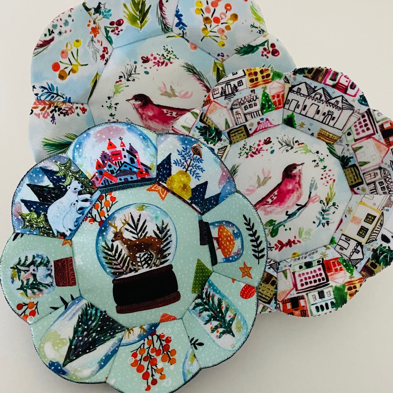 • Instructions, photos, and master template pages to make beautiful scalloped fabric bowls in 7 different sizes using English Paper Piecing (EPP) techniques with a twist.
