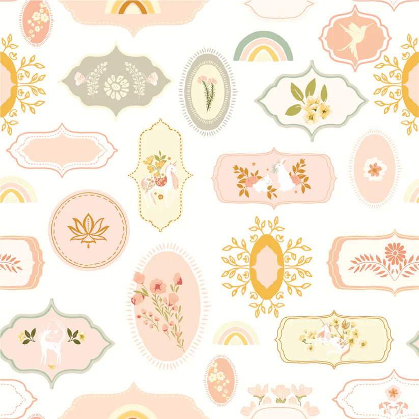 Unicorn Dreams by Ginger Deverell will have your head spinning with its whimsical beauty and artistry. There are unicorns, butterflies, bunnies, birds, bugs dancing among the gorgeous flowers. The large poppies are light and airy. All the patterns are dainty with beautiful soft greens, pale peaches and buttery yellows.