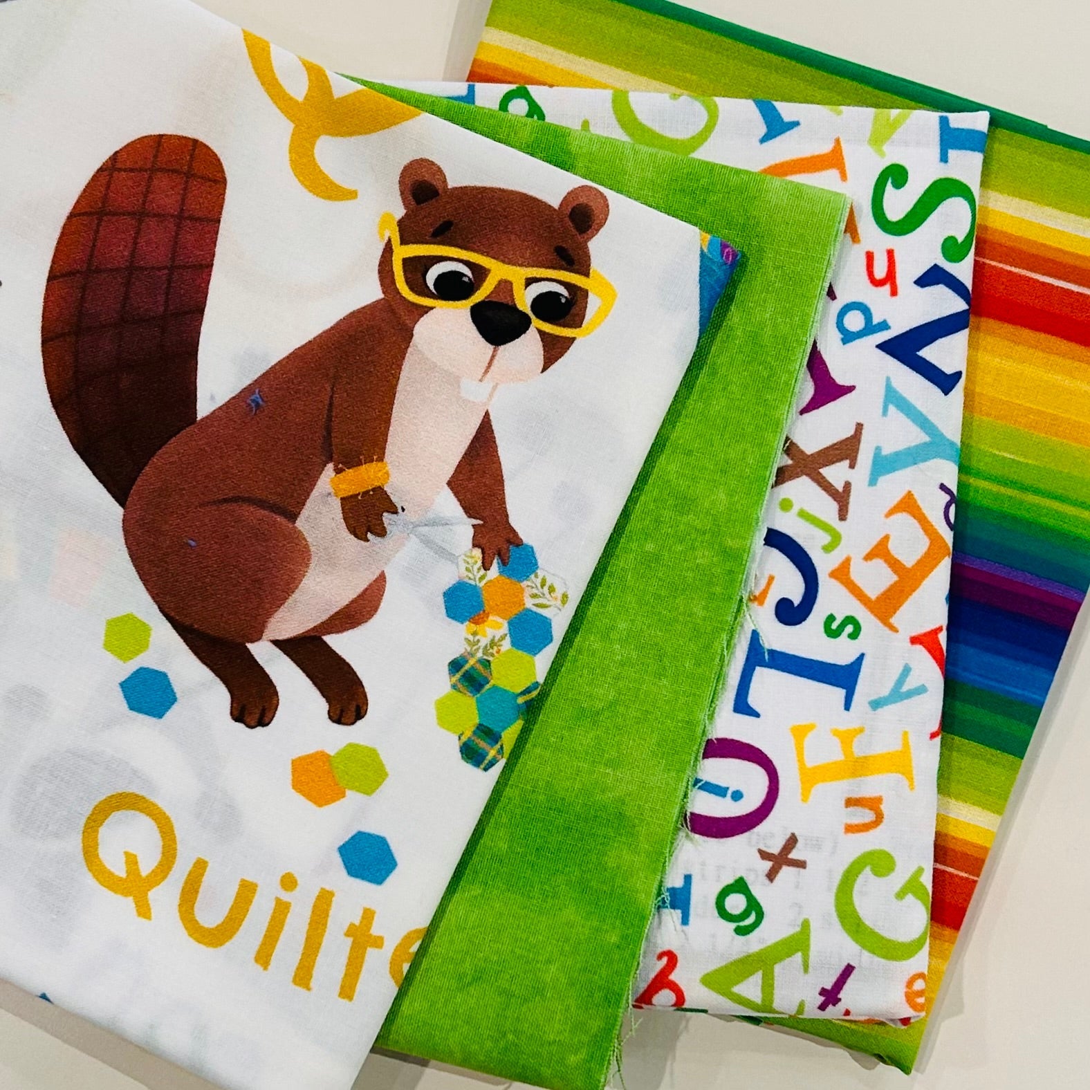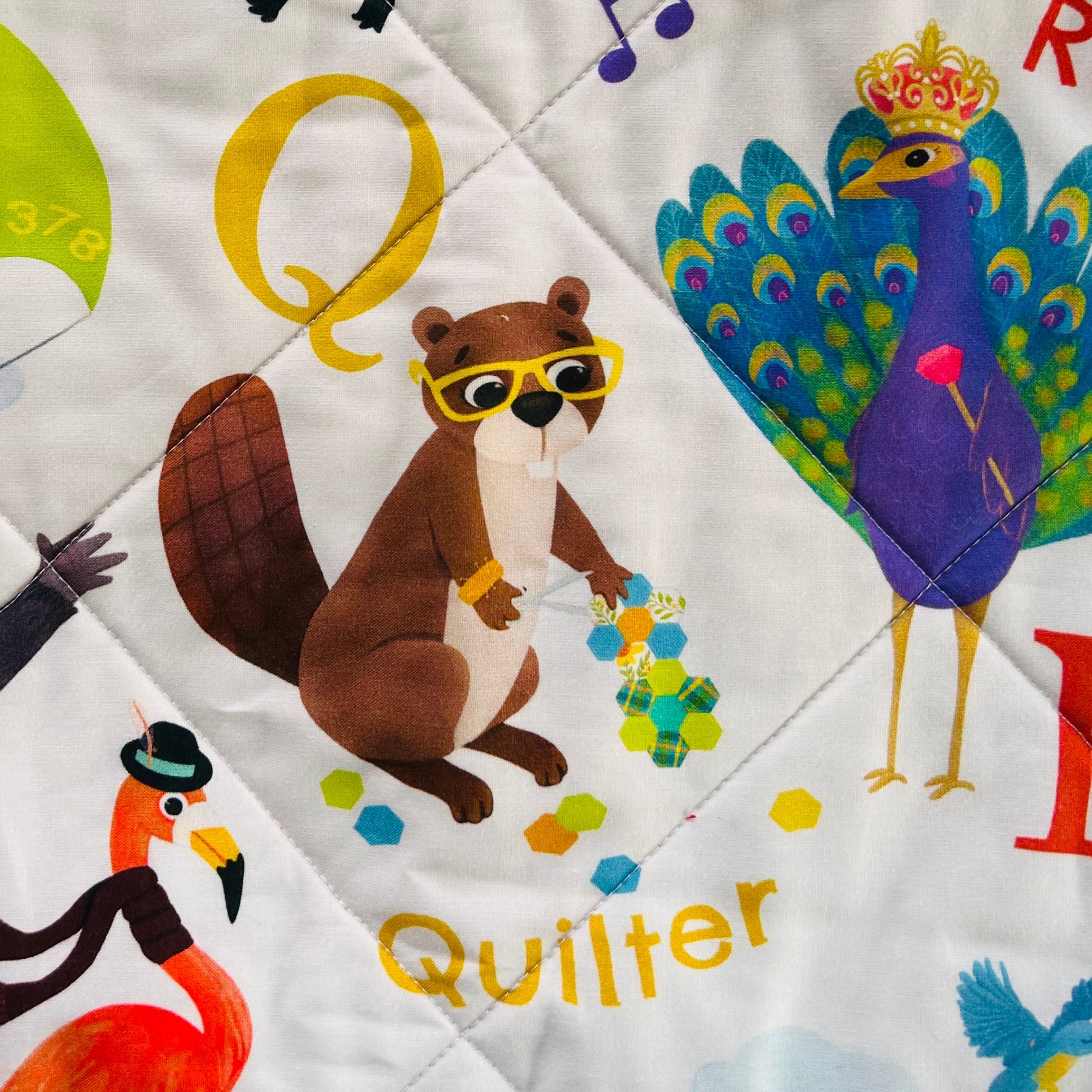 Q is for quilter! Adorable! Our new 'ABC's" is an easy quilt or playmat to create. Bright and cheerful. Kit includes alphabet panel, borders and binding. 100% cotton. 37" x 43"
