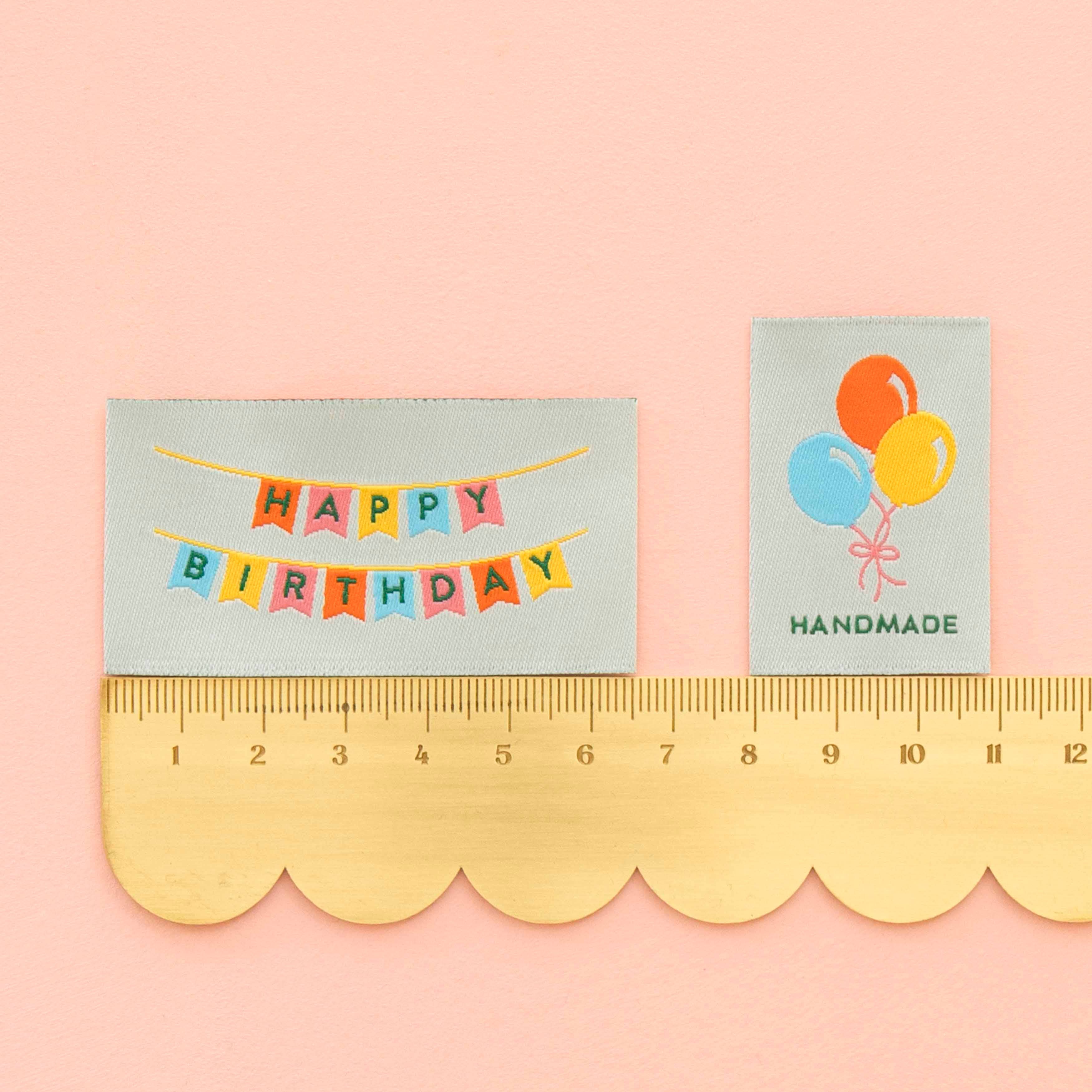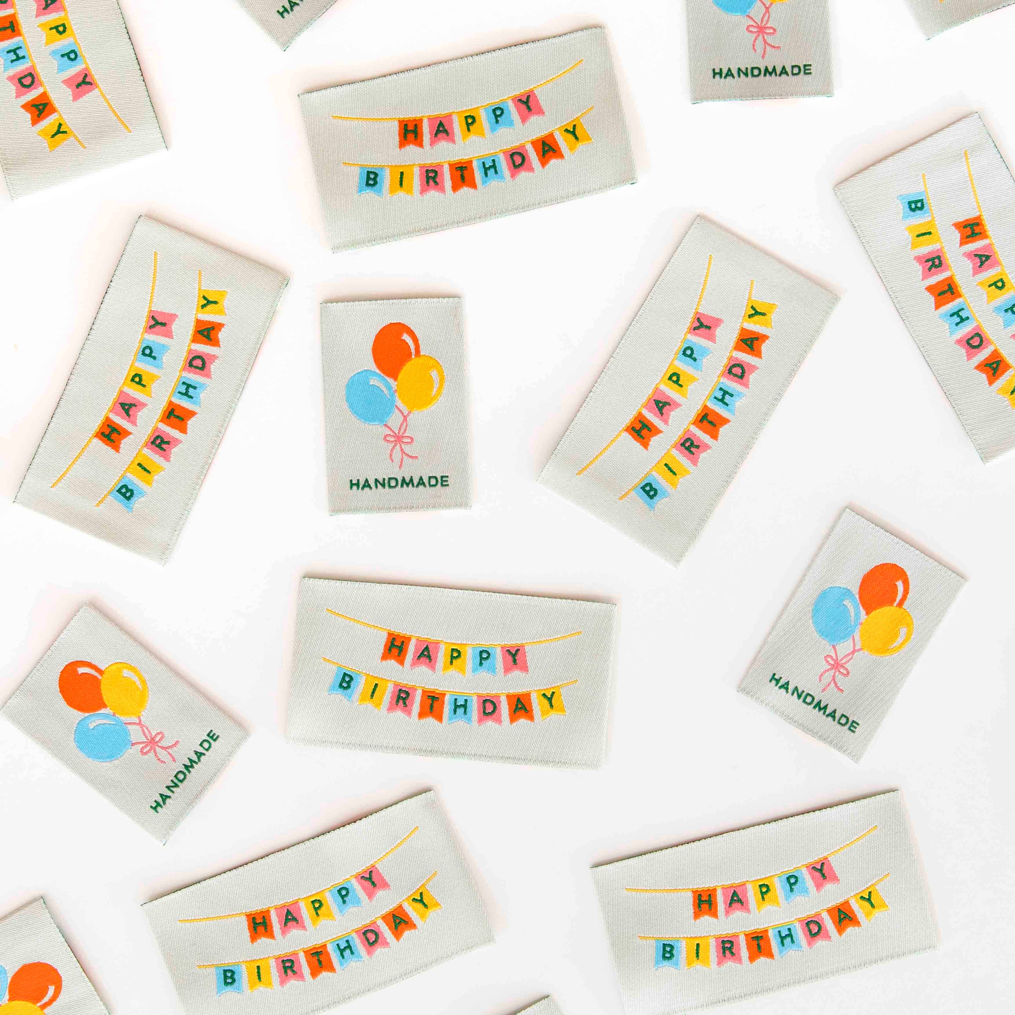 - These soft polyester labels feature cute balloons and a birthday banner, perfect for sewing onto garments, bags, or quilts.