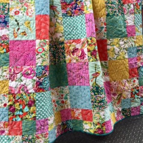 Our Boho quilt kit is an easy quilt to make ~ perfect for the beginner quilter. Two different sized squares and a collection of 16 fabrics in warm colours and fabulous prints makes this eclectic quilt the perfect addition to add a splash of boho charm! Kit includes instructions and all fabric for quilt front and binding.