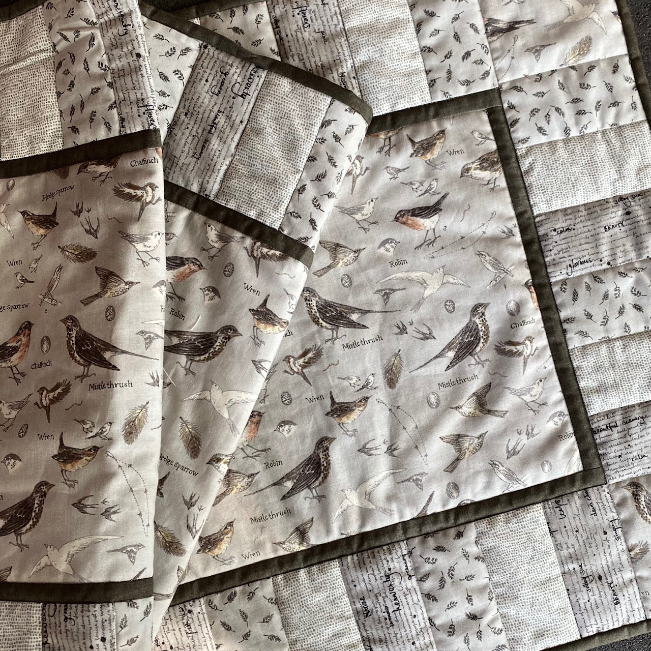 We used Janet Clare's sweet nature-inspired fabric "Botanicals" to create our latest table runner.  Kit includes instructions and all fabric for runner front - gentel shades of grey prints and an ash toned border and binding. Ever so lovely!!