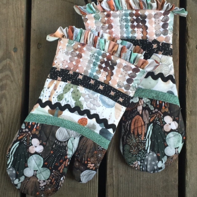 It's all in the fabric! This striking collection called Desert Wilderness is by Figo. Warm rich colours. Kit includes pattern and all fabric for 2 oven mitts including lining. Requires heat resistant batting.