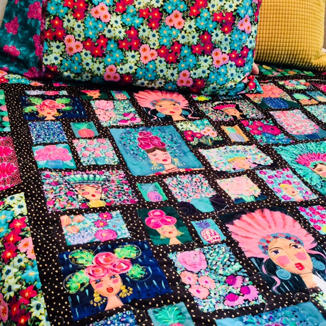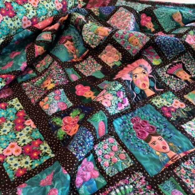 This fabric! We fell in love with the rich colours and bohemian vibe! Designed by Jennifer Paganelli for Freespirit. Super easy quilt ~ the centre is a panel of fabric, two framing borders of black and a centre border featuring six different prints in various sized rectangles. Voila! Kit includes instructions and all fabric for quilt front including binding.
