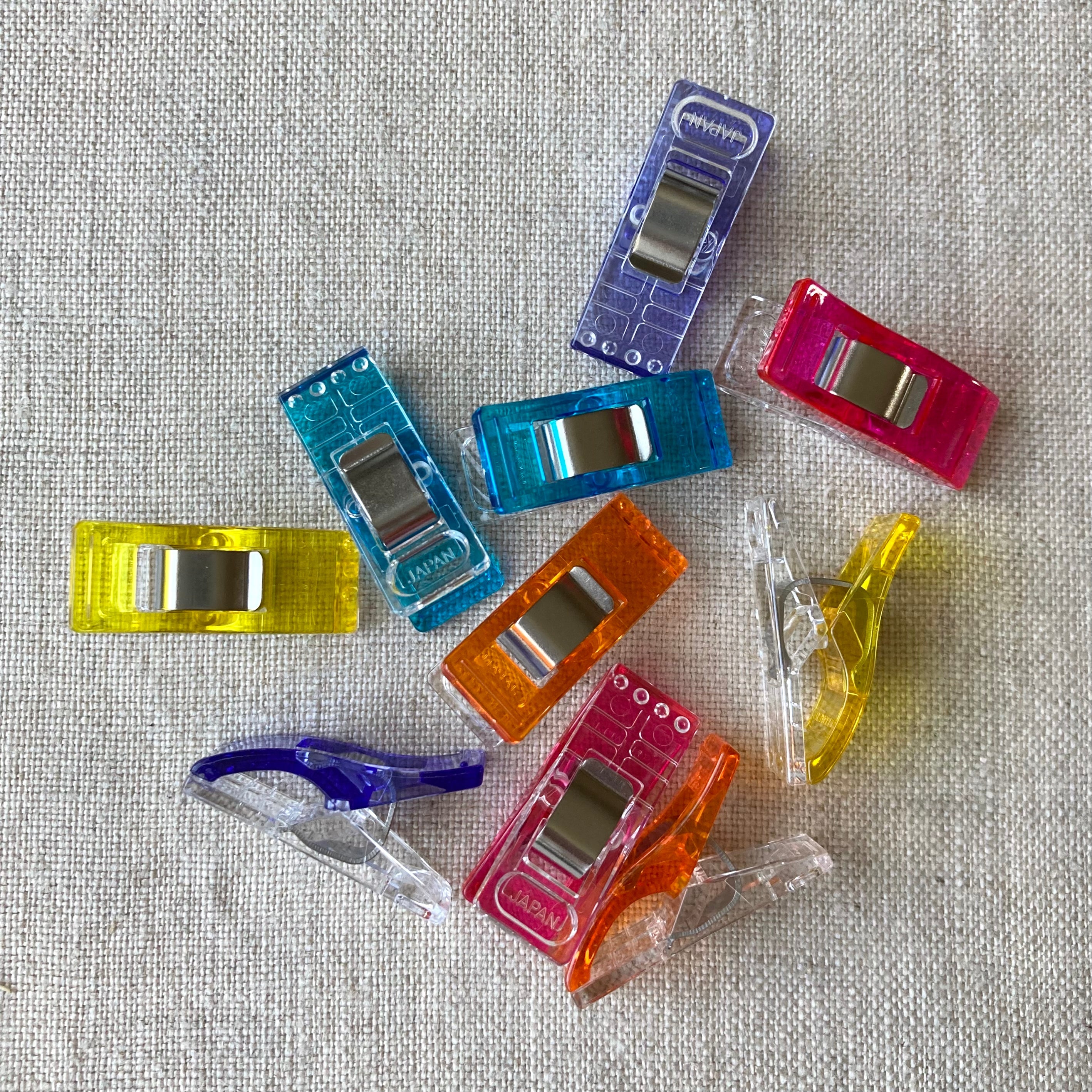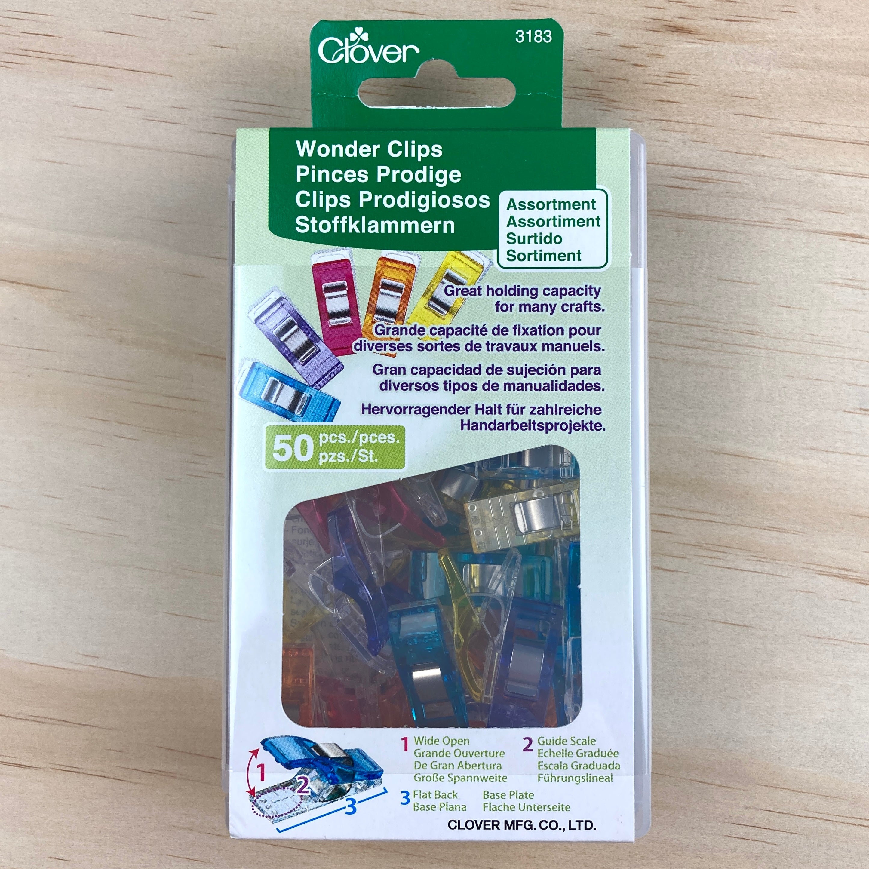 Clip opens wide to hold layers of fabrics.