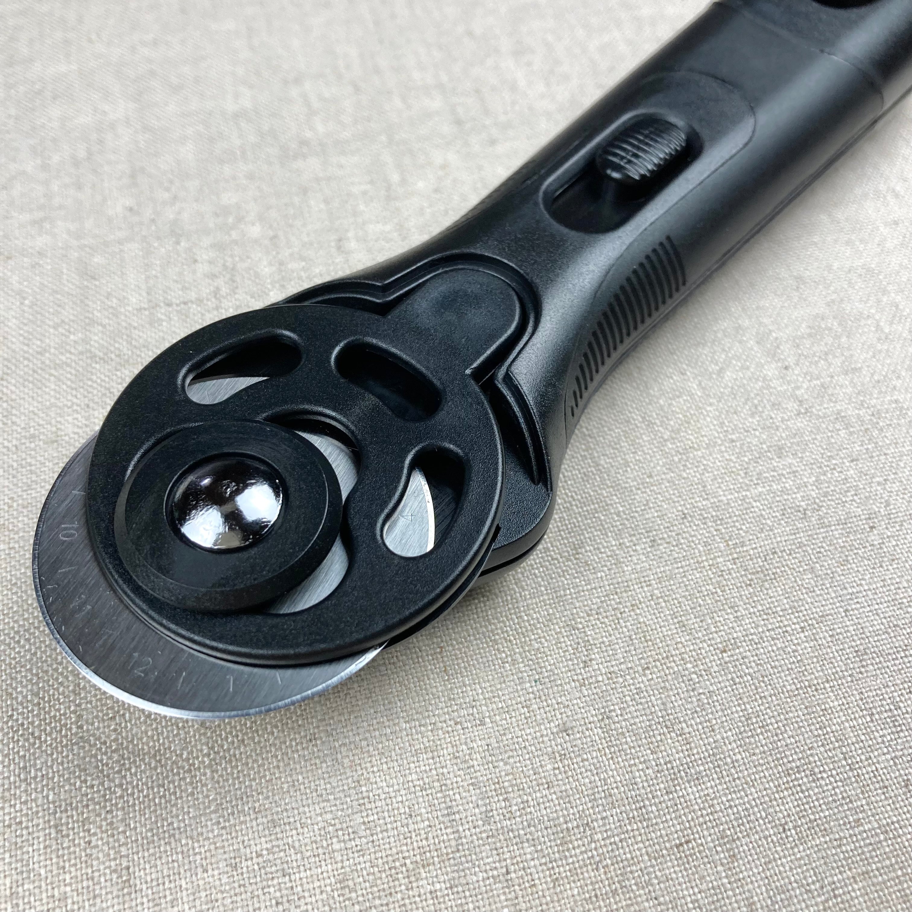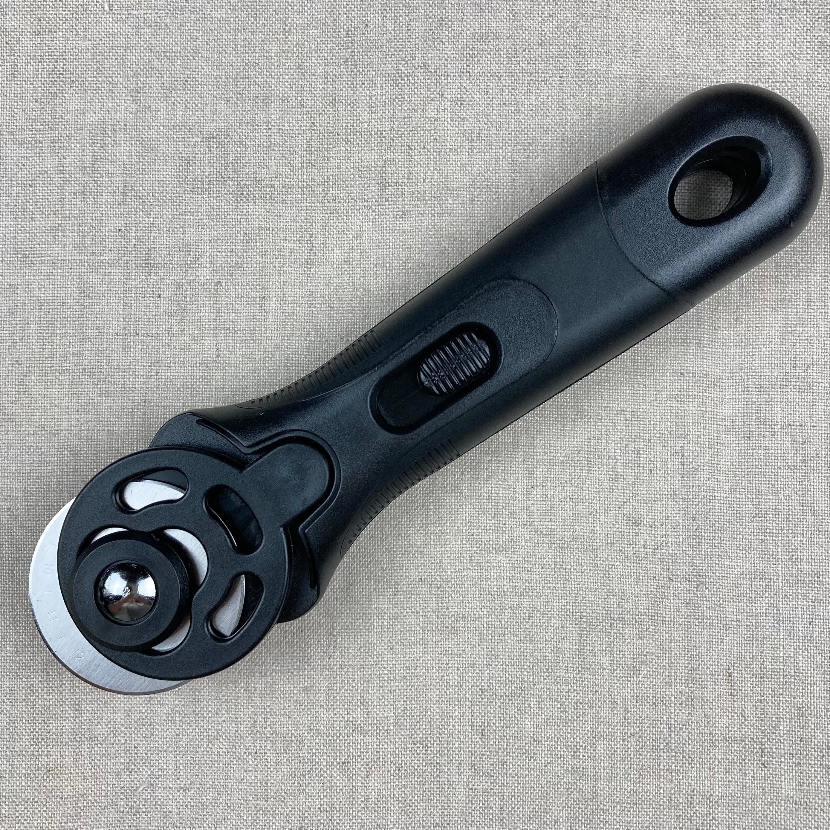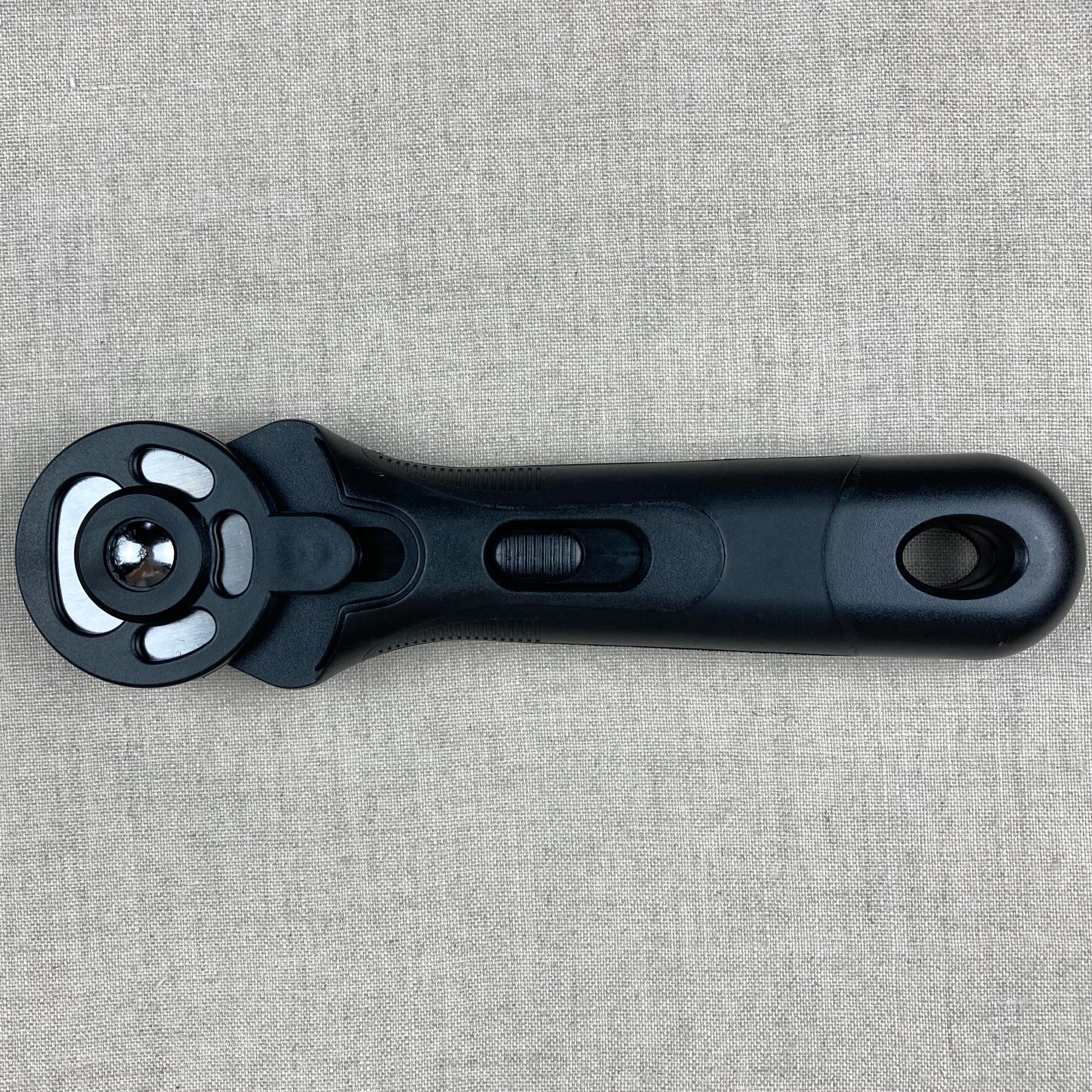 This 45mm rotary cutter features a lightweight, straight handle with a quick push-to-release button.