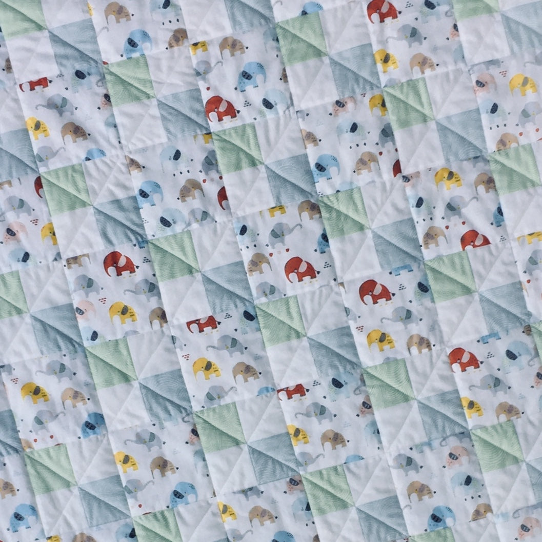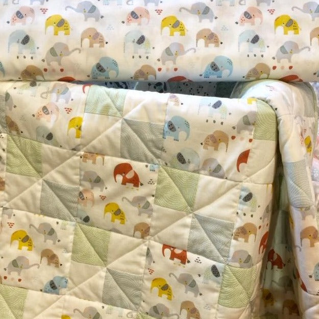 A very simple four patch quilt. Delightful little elephants and an easy four patch made from colours of soft watery blue, sea foam green and warm white squares. Perfect! Kit includes instruction and all 100% cotton fabric for quilt front and binding.