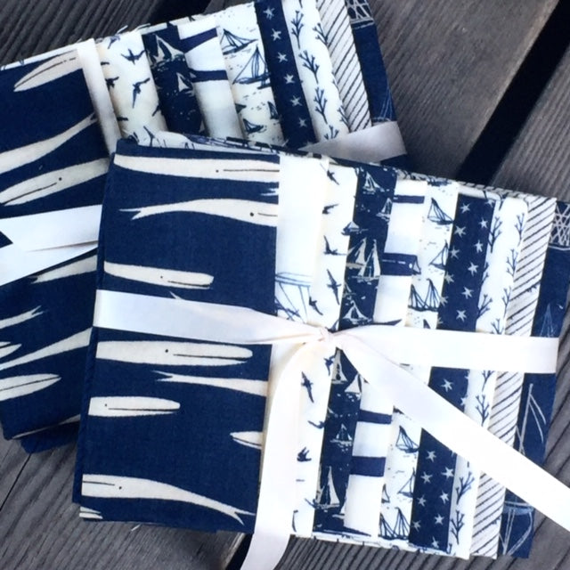 Clean, fun, nautical prints! This very simple table runner shows off Janet Clare's Ebb and Flow fabric collection to it's best. Kit includes instructions and all fabric for runner front and binding. Finished size 18" X 52 1/2".
