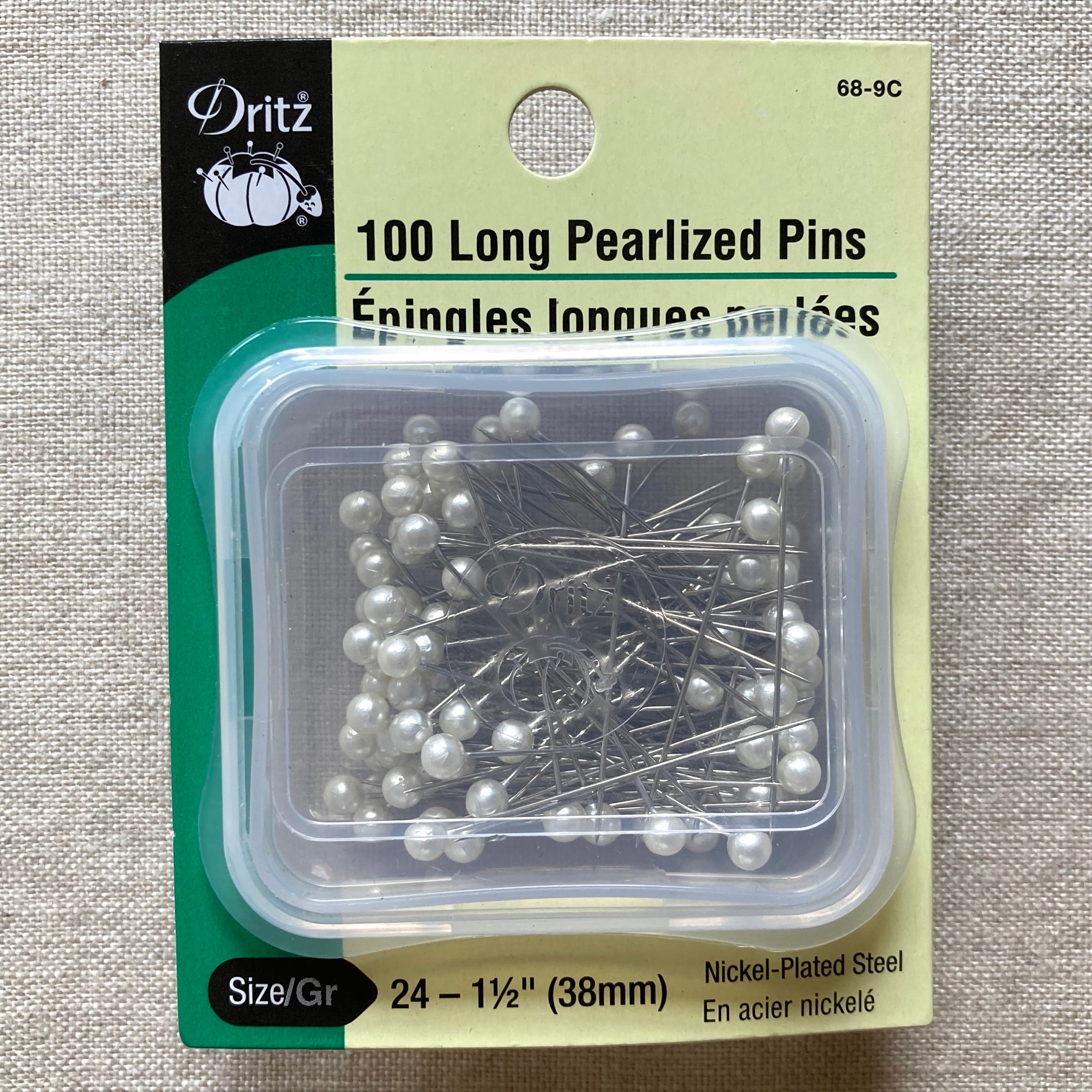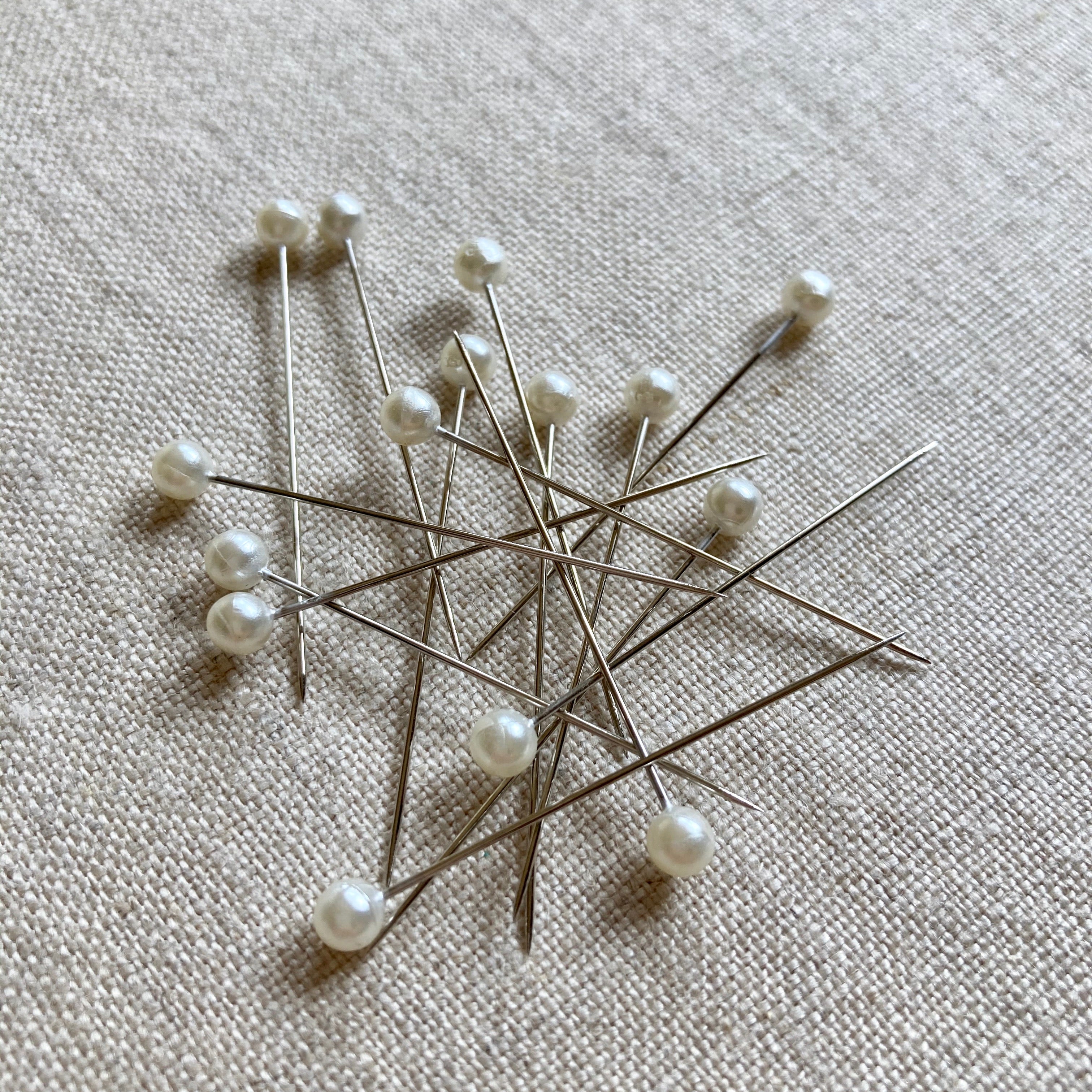 Nickel-plated steel pins with large, white pearlized plastic heads