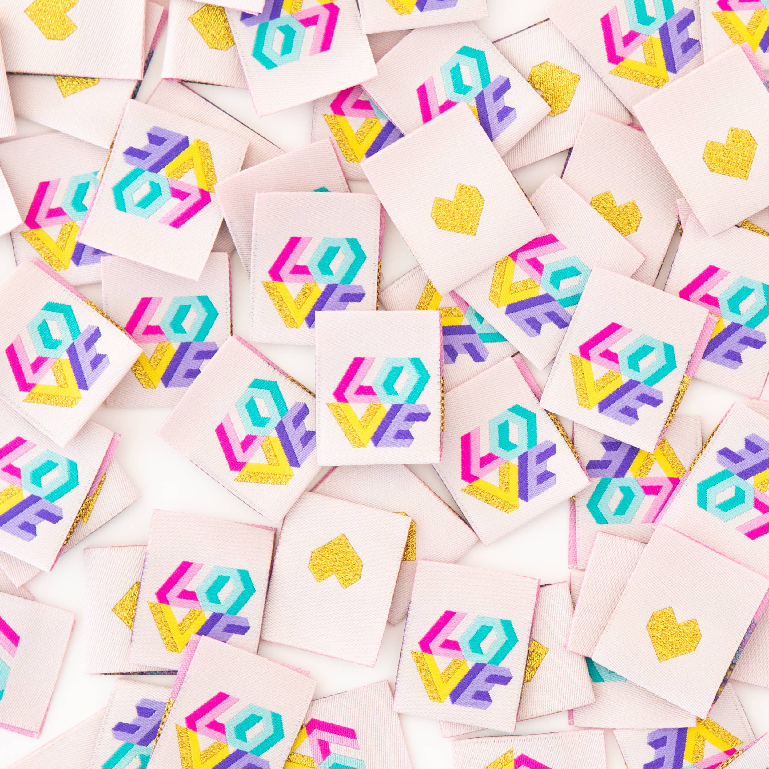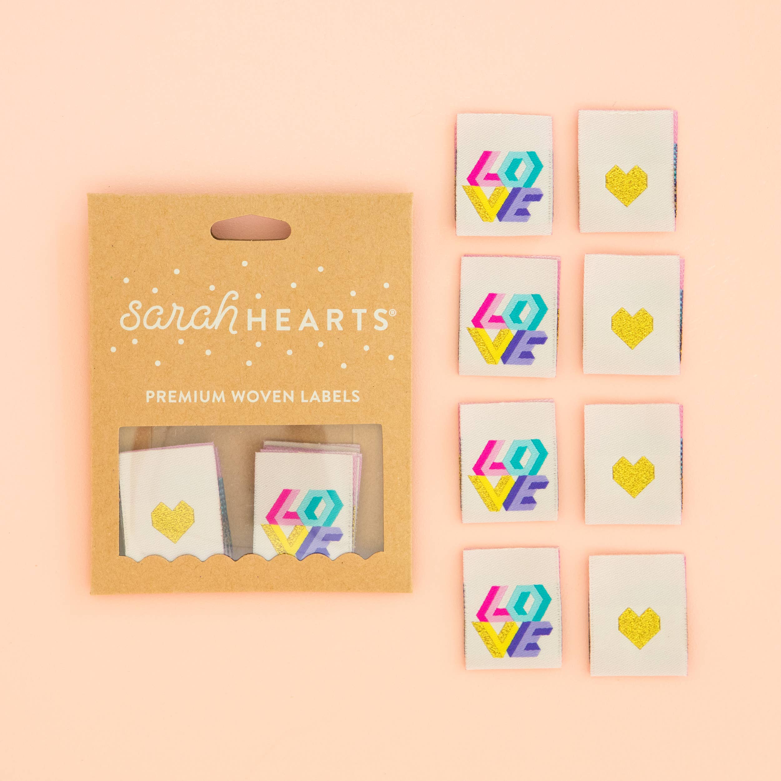 Each label has a vibrant LOVE design on the front and a metallic gold heart on the back.