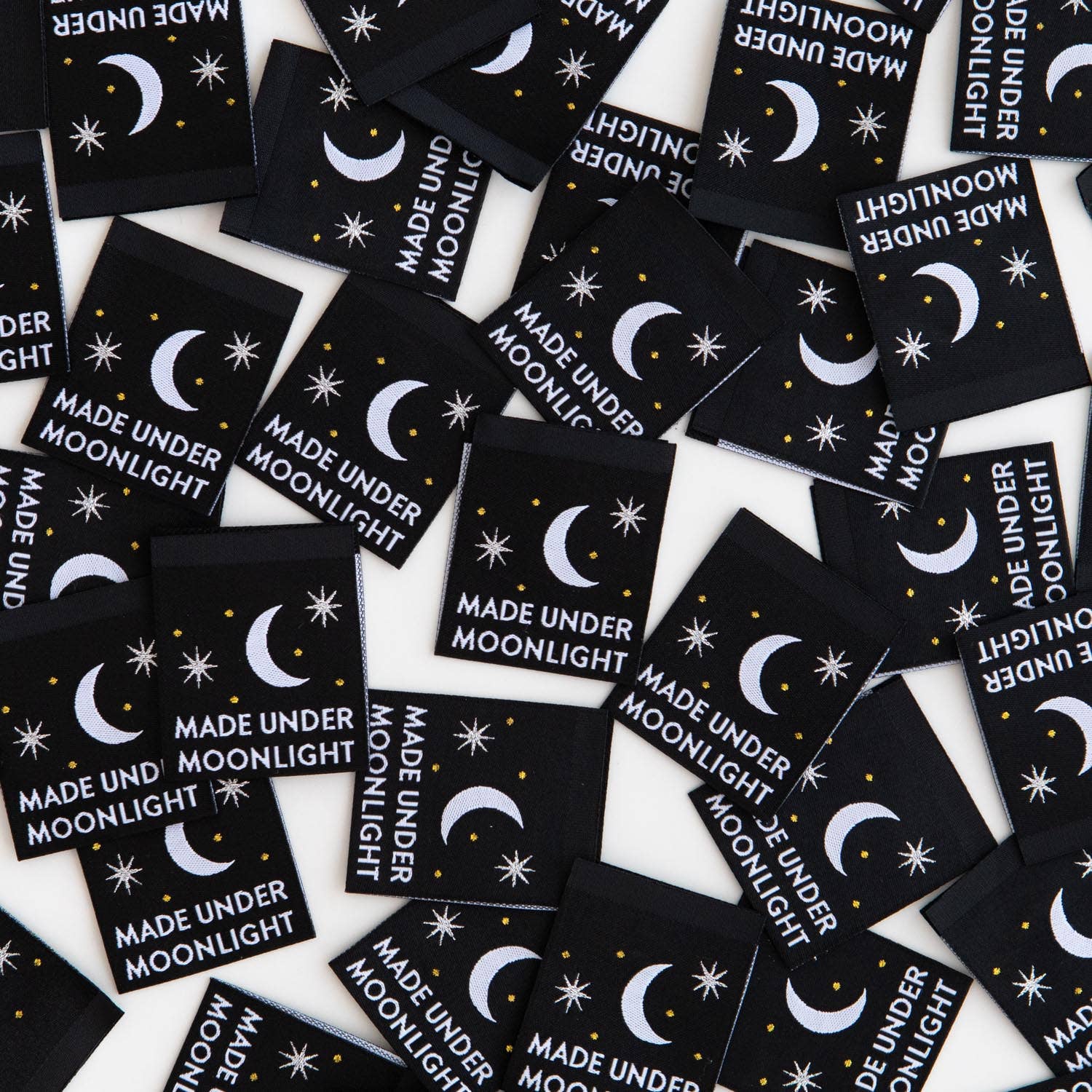 Do you find yourself creating under the moonlight? This label is for all night owl makers! This large woven label features metallic silver and gold accents on a silky soft black background.
