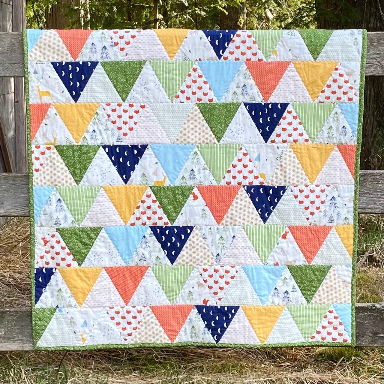 Cheery colours and fun prints (who can resist that little fox face?!) make up our Nicky quilt. Trees, foxes, deers and happy little moons! Perfect size for a baby or a toddler. Kit includes instructions and all fabrics for quilt front and binding. 100% cotton. Finished size 45" x 55"