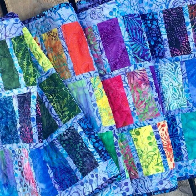 Our Prism table runner kit includes instructions and all fabric for runner front and binding. Beautiful 100% cotton batiks in a complete rainbow of colours!