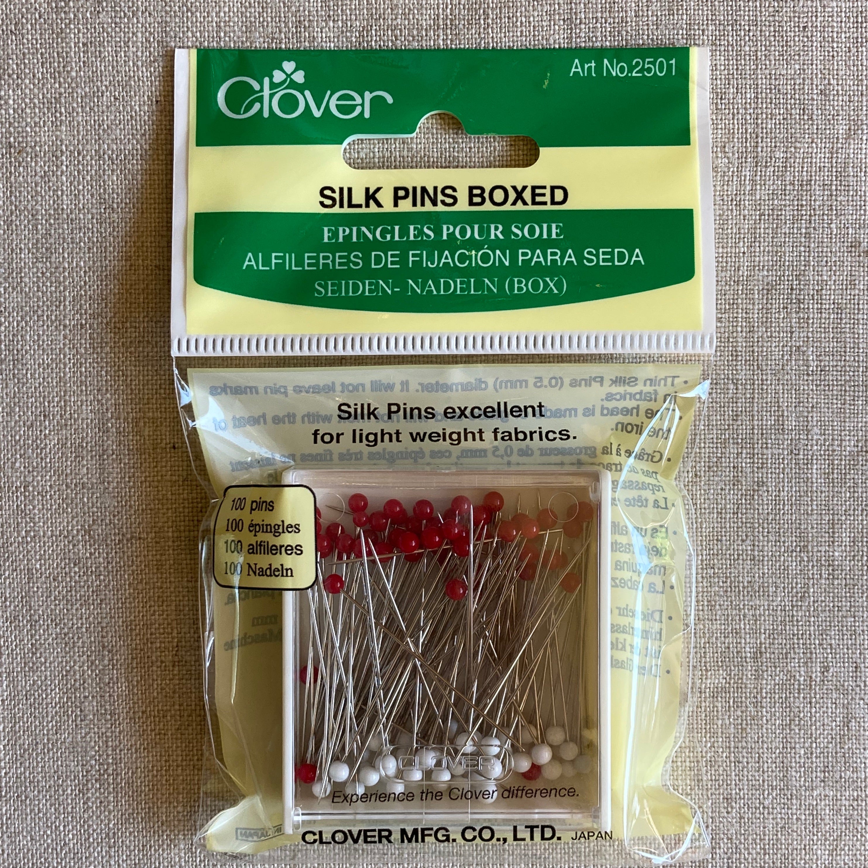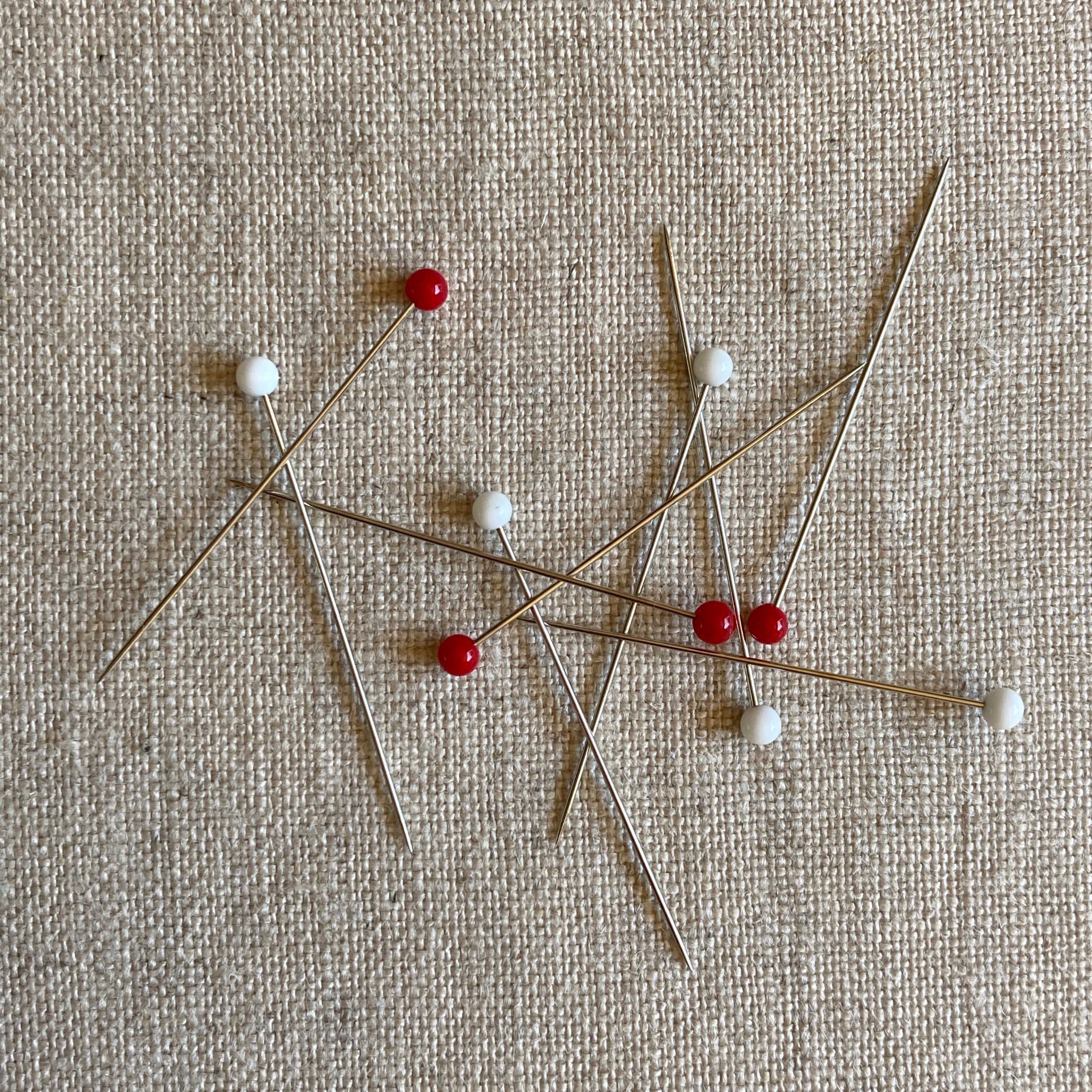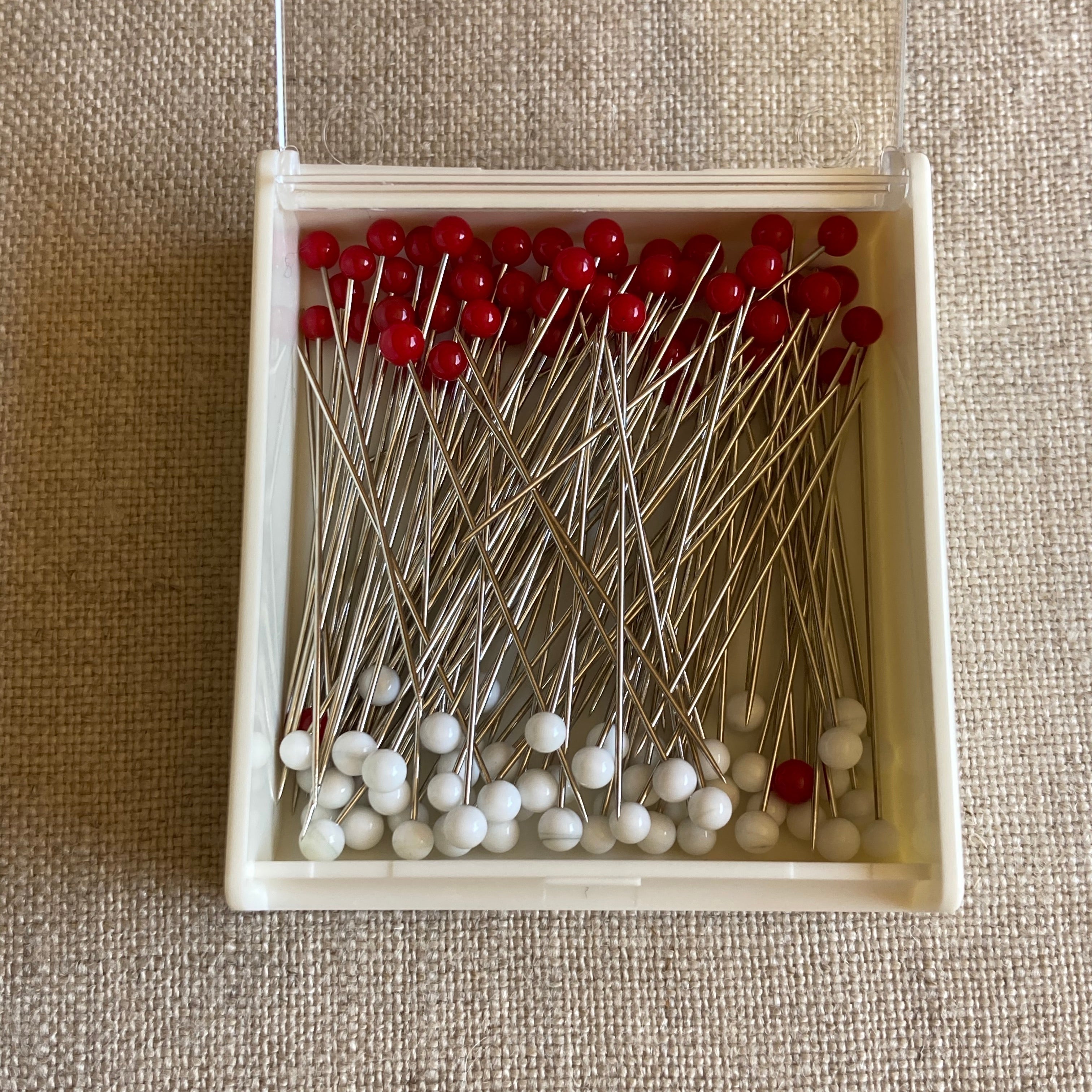 100 pins with red and white glass heads that will not melt with the heat from the iron.
