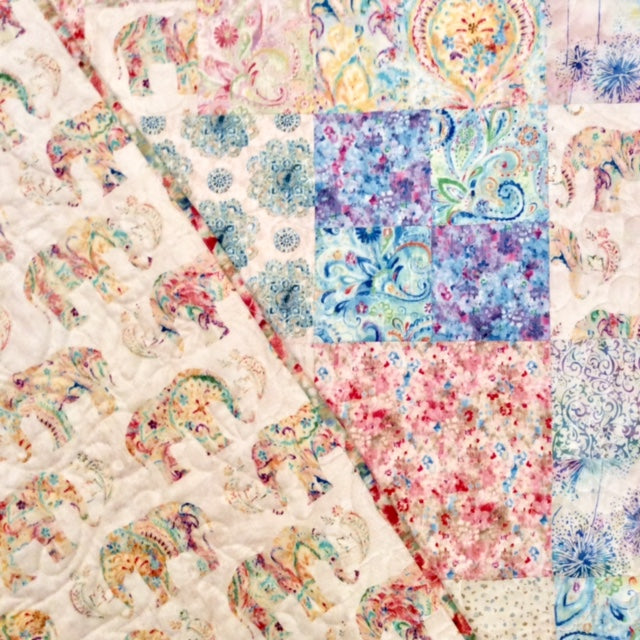 Who doesn't love these majestic, soulful creatures?!! The elephants, medallions and watercolour washed prints evoke a warm bohemian vibe! Kit includes instructions and all 100% cotton fabric for quilt front and binding. 64" X 72"