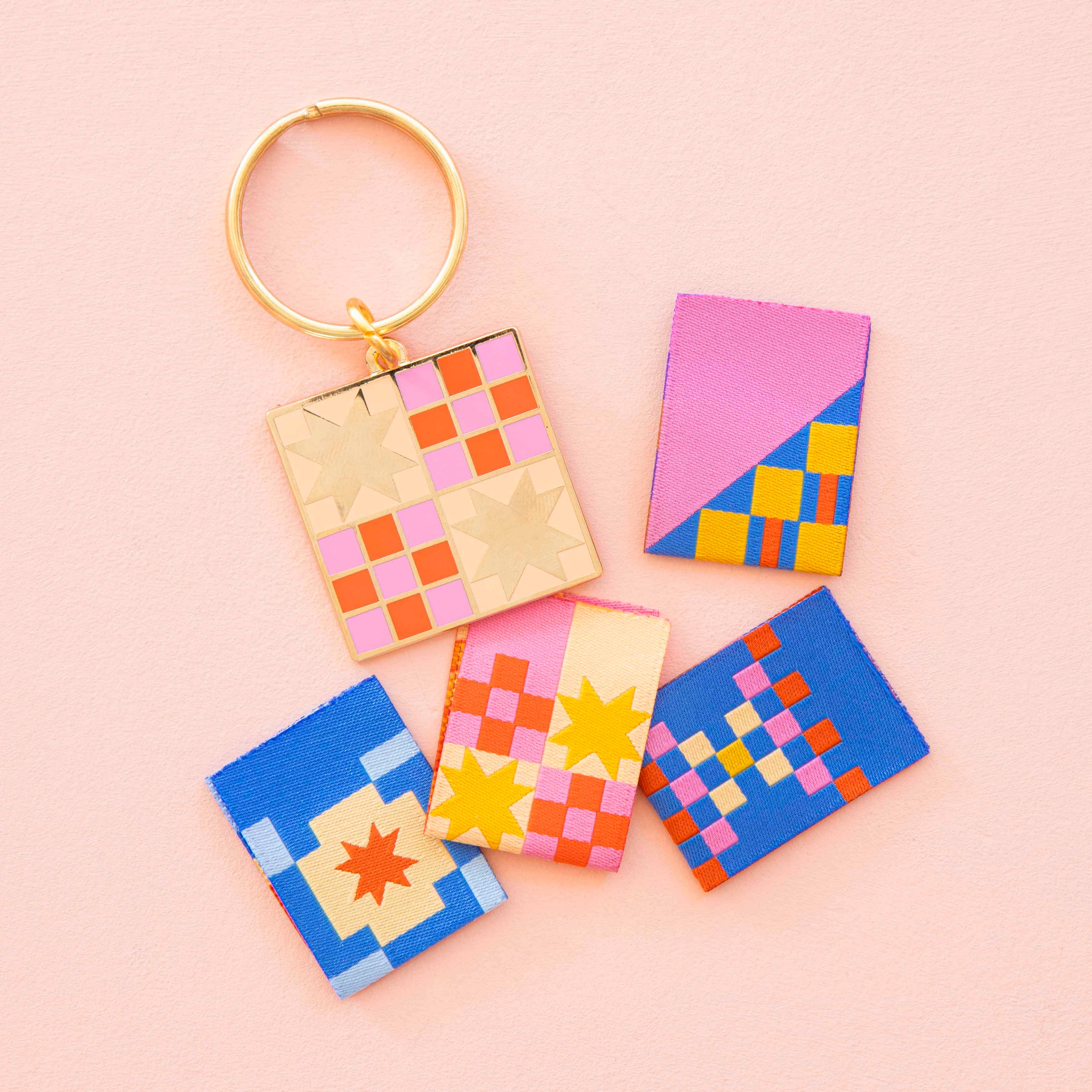 This enamel keychain features a cheerful color palette and metallic gold accents, all inspired by the Campfire Glow Quilt Pattern by Then Came June.