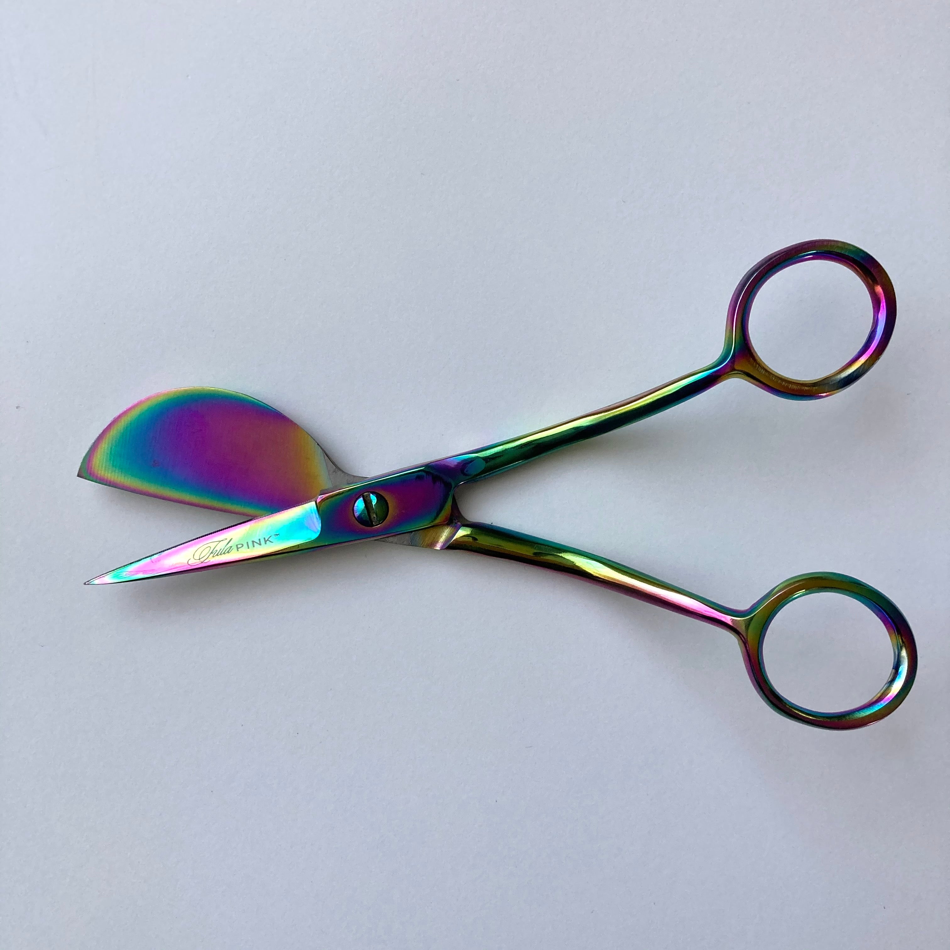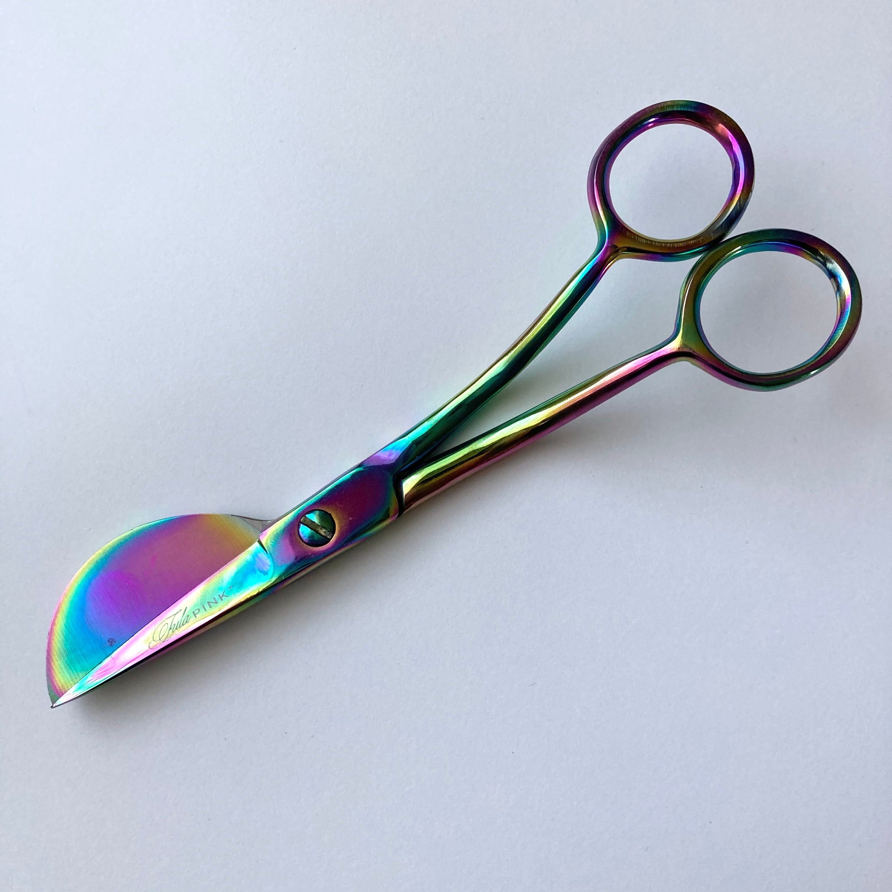 4" from handles to tip of the blade, multi-coloured prism finish.