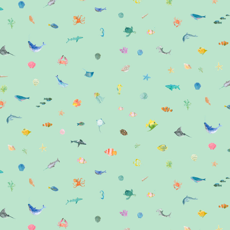 Painted in intricate watercolour detail, the designs are full of interesting aquatic creatures and treasures. Beautiful shoals of colourful fish, pretty seahorses and friendly sharks swim across the fabrics.