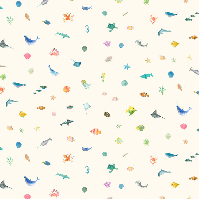 Painted in intricate watercolour detail, the designs are full of interesting aquatic creatures and treasures. Beautiful shoals of colourful fish, pretty seahorses and friendly sharks swim across the fabrics.