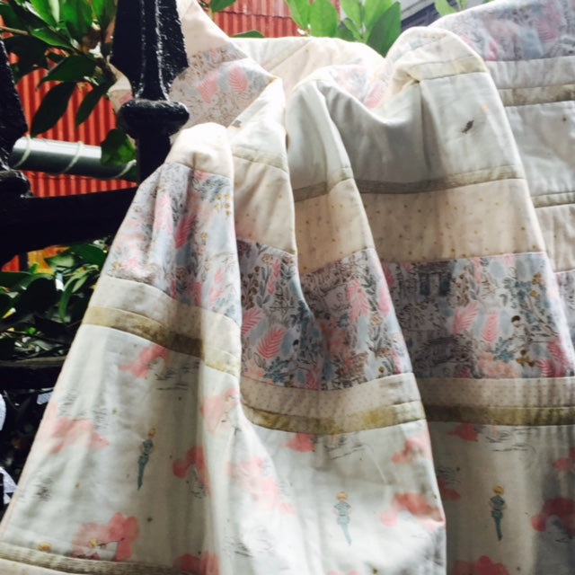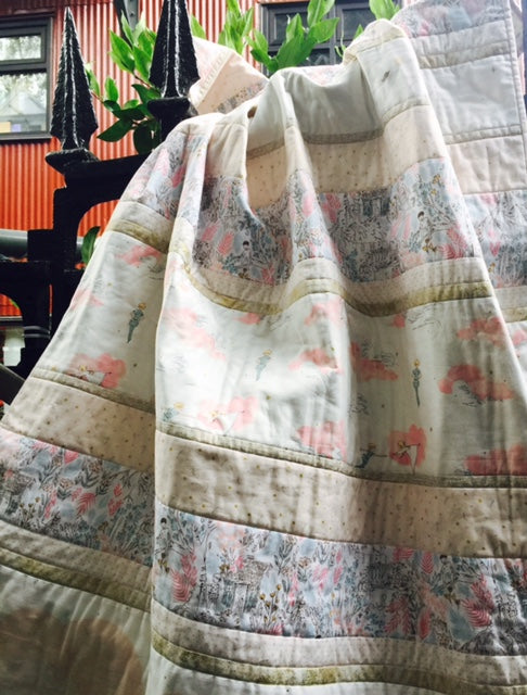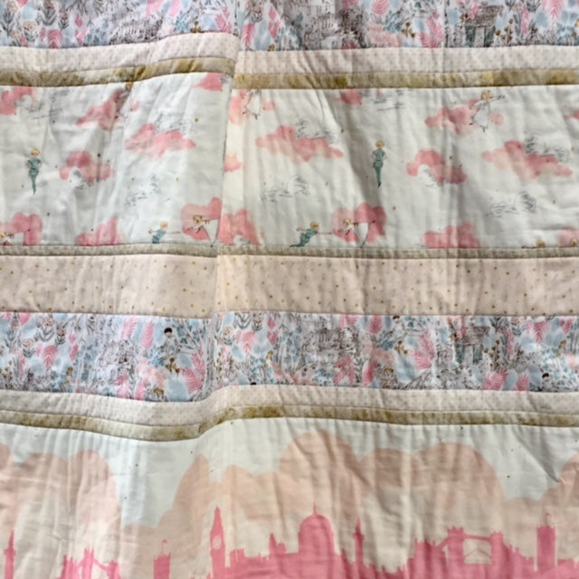 Sweet Wonderland! Peter Pan, Wendy, London skyline, pink clouds and tiny gold pixies mix for this delightful quilt! 100% cotton fabrics from Michael Miller. Kit includes instructions and all fabric for quilt front including binding. Quilt measures 40/42" X 55".