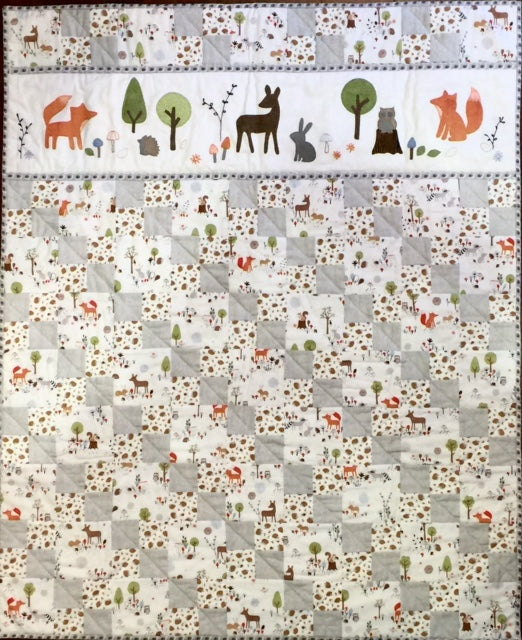 Adorable "Woodland Babies" features a banner of appliqued baby animals and trees, as well as embroidered leaves, mushrooms and flowers! Applique using your favourite technique ~ though in this project we recommend using fusible web with either raw edge or using a blanket stitch to finish. Simple squares and four patches are easy blocks to create. Kit includes instructions and all fabric for quilt front, binding and DMC embroidery floss. Does not include fusible webbing, batting or backing.